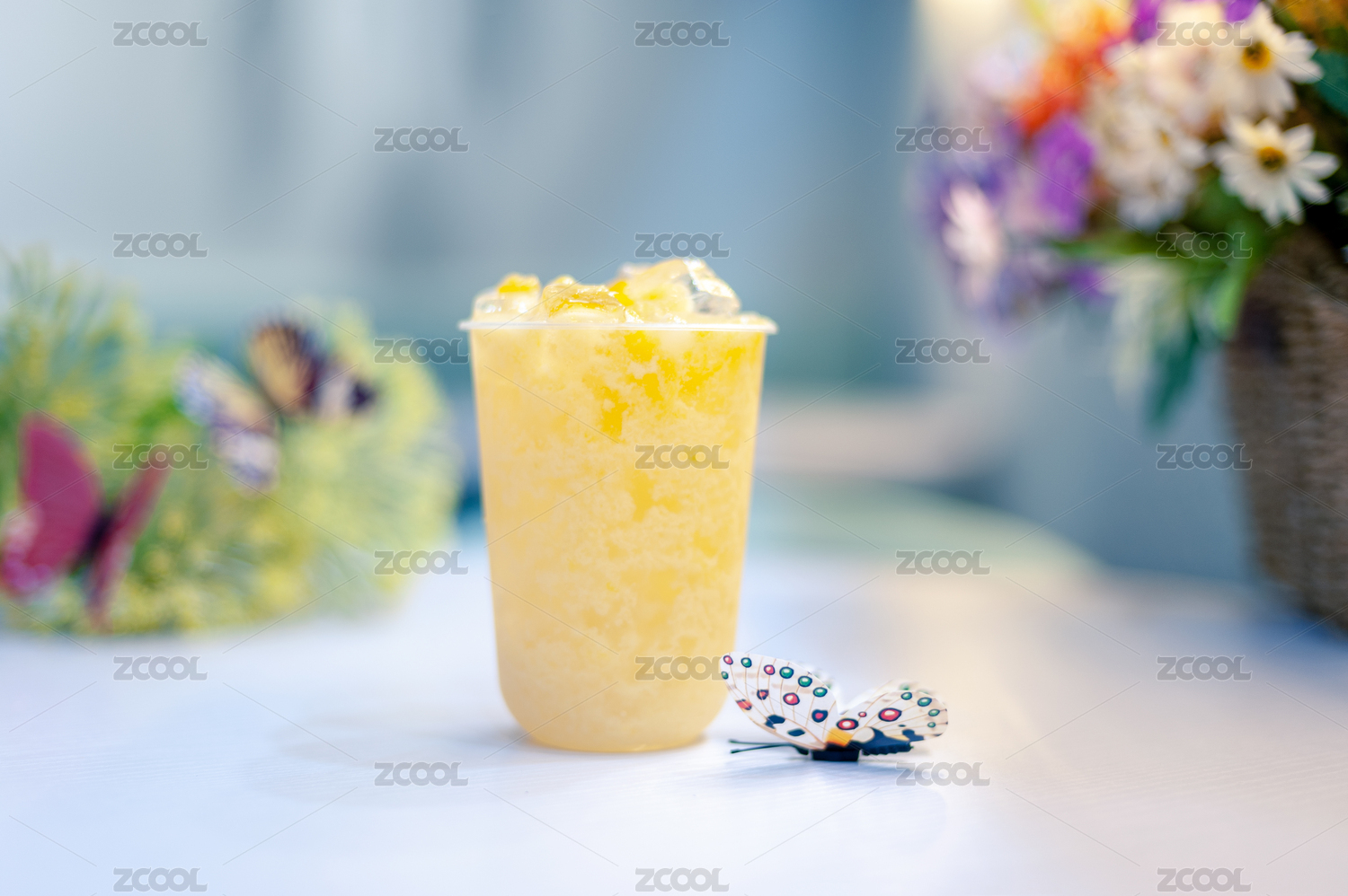 休閑吧白色桌子上放置的一杯西柚牛奶飲料