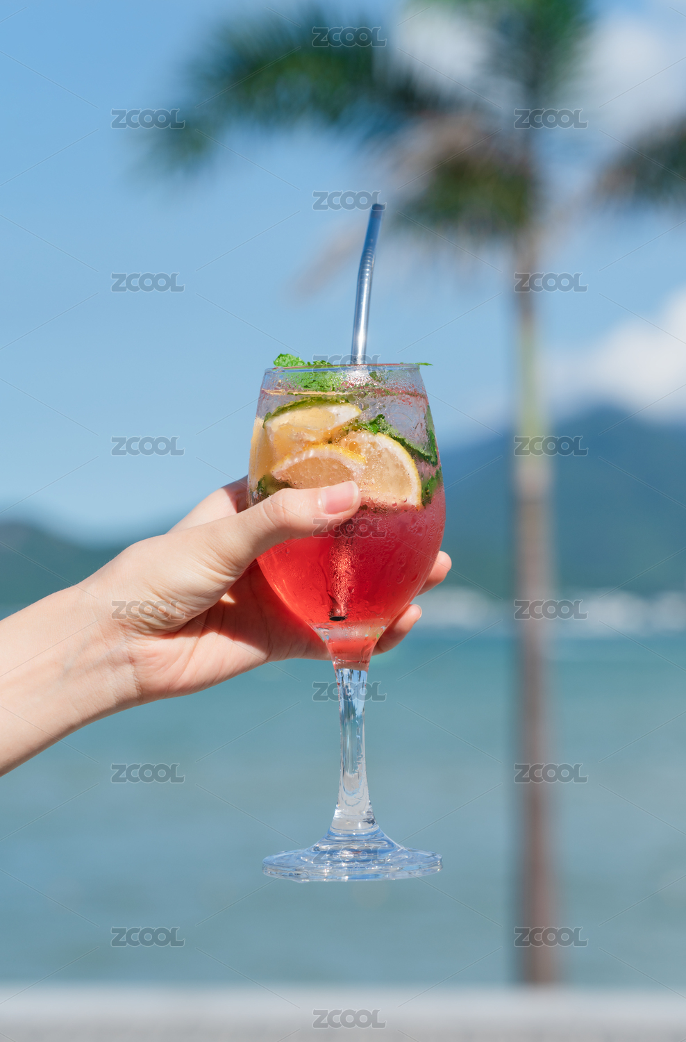 手拿著一杯紅色飲料在海邊