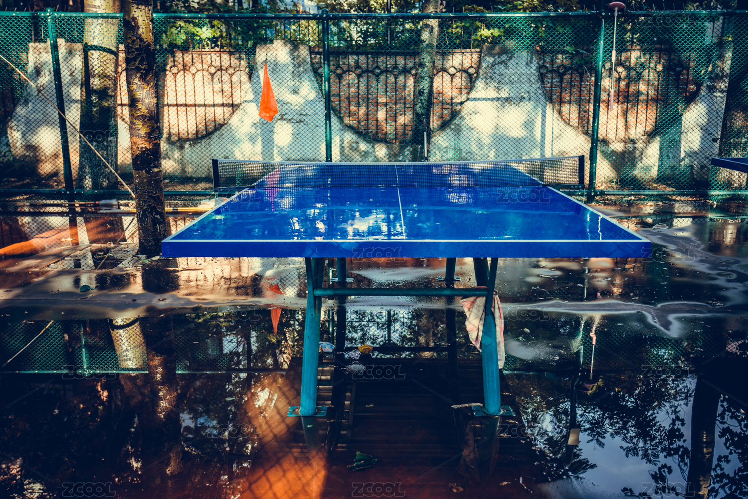 夏天雨后運(yùn)動(dòng)場中的乒乓球桌光亮如新