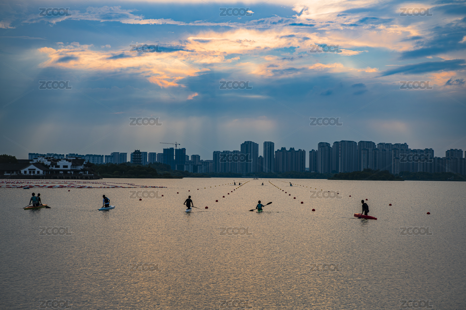 湖畔夕陽(yáng)下的槳板運(yùn)動(dòng)者