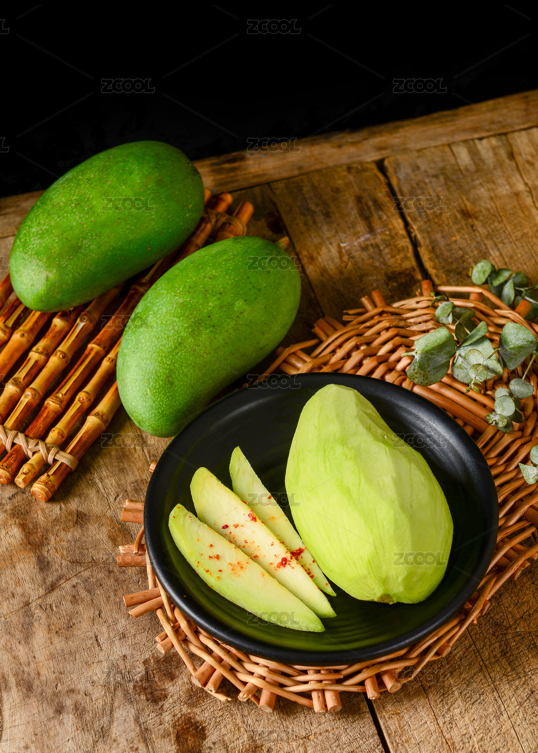 木桌上擺放的新鮮青芒果