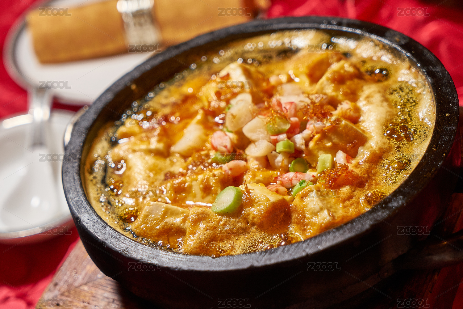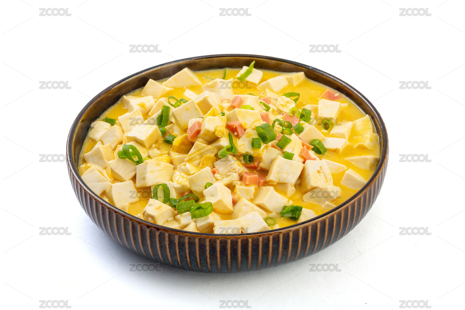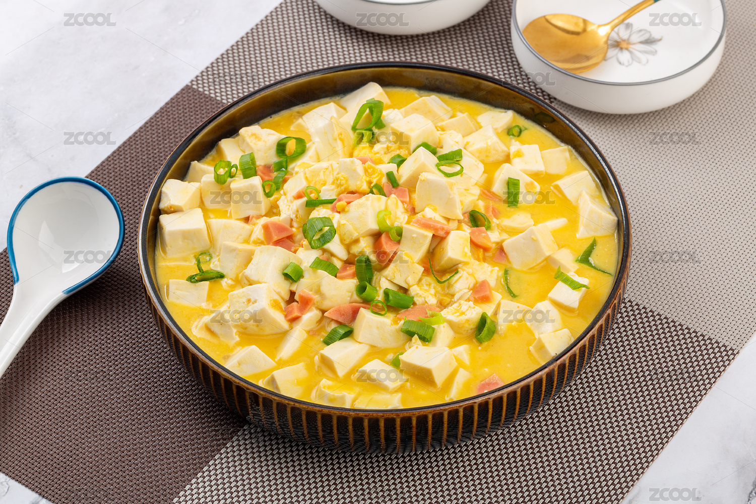 傳統(tǒng)名菜蟹黃豆腐裝在黑色鐵盤里面