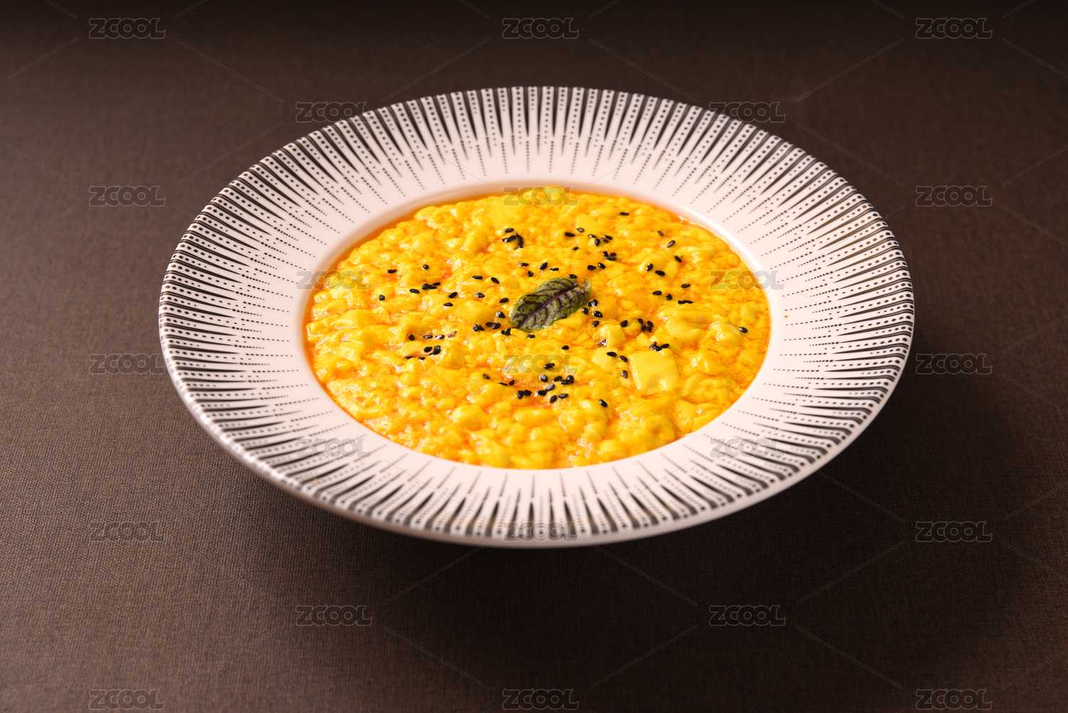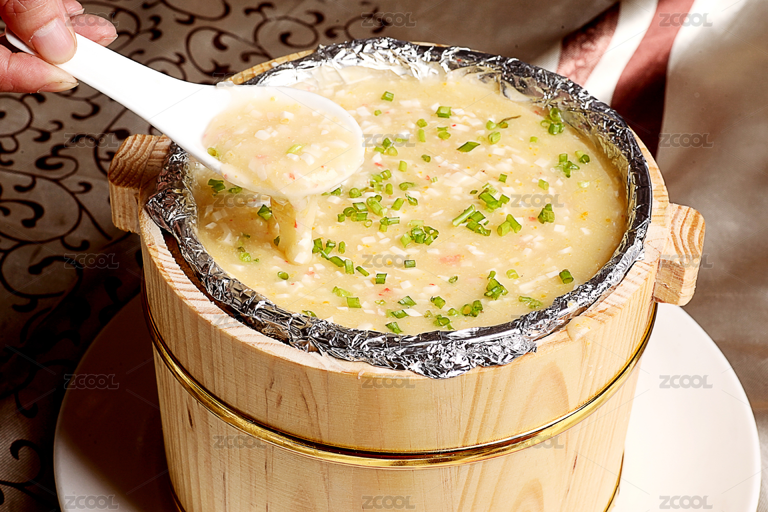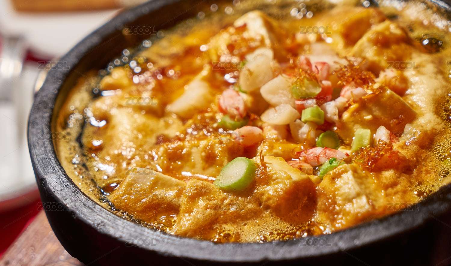 傳統(tǒng)名菜蟹黃豆腐裝在黑色鐵盤里面