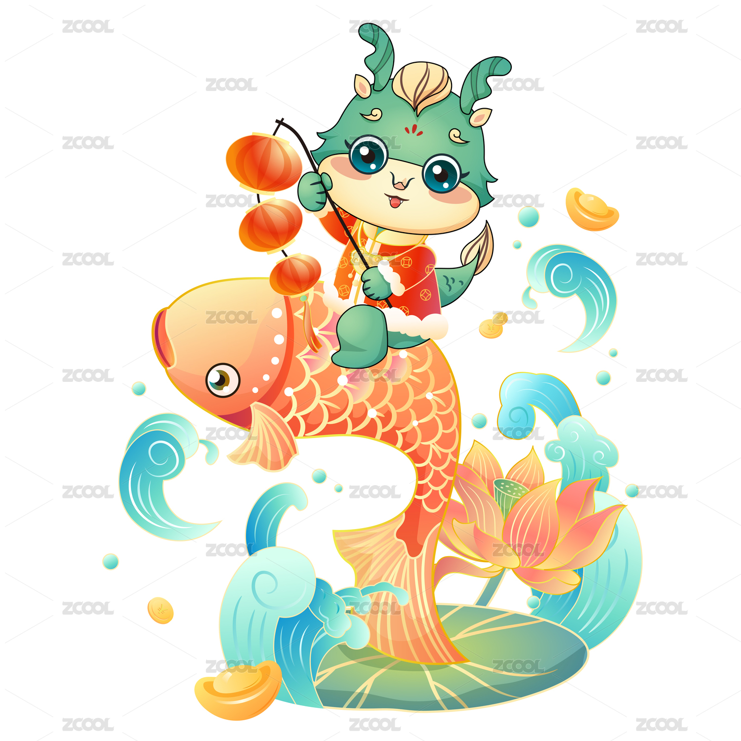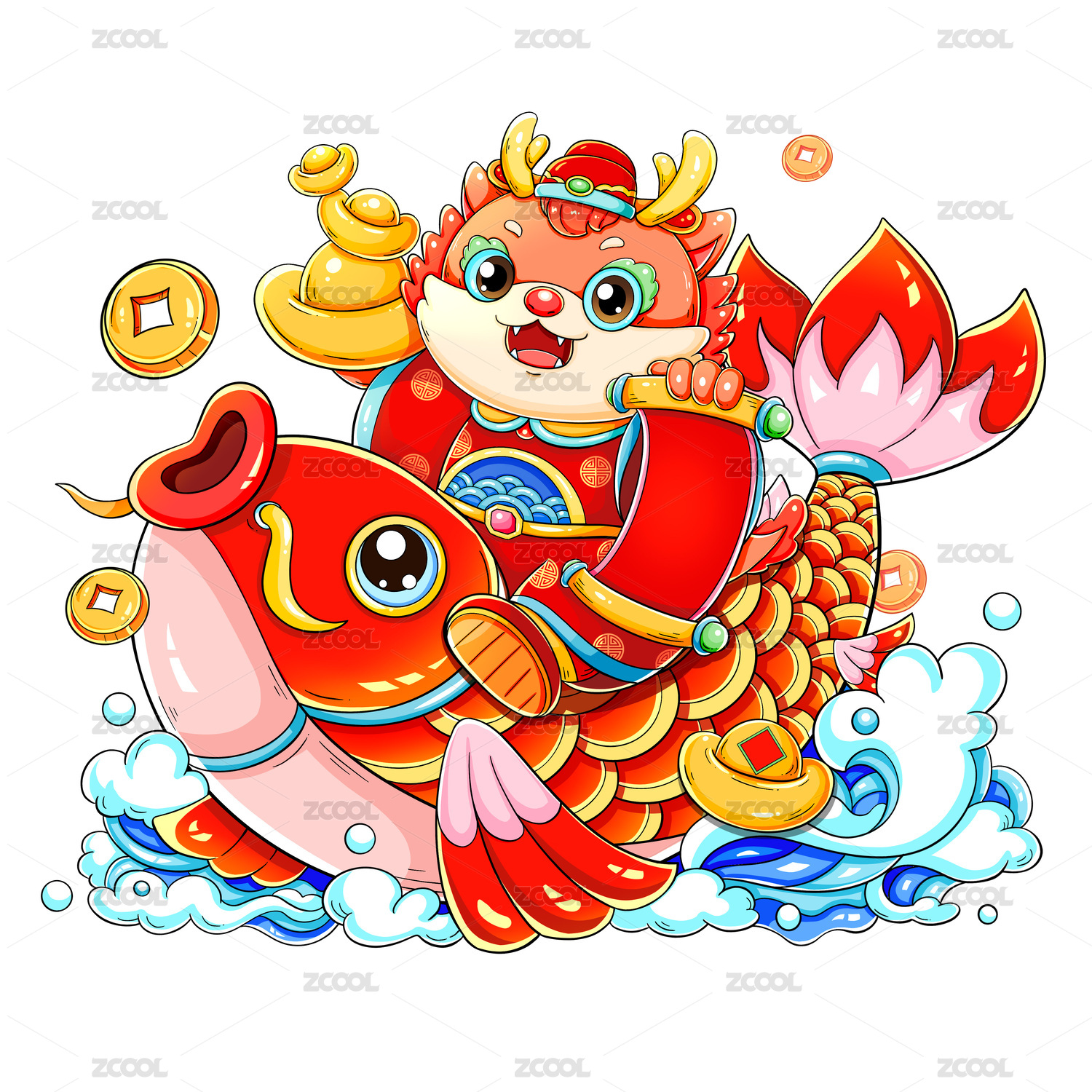 龍年新年卡通龍騎著錦鯉祝福新年插畫