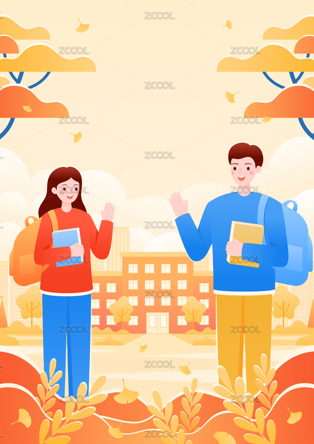 秋天開學(xué)季男女學(xué)生入學(xué)校園風(fēng)景矢量插畫
