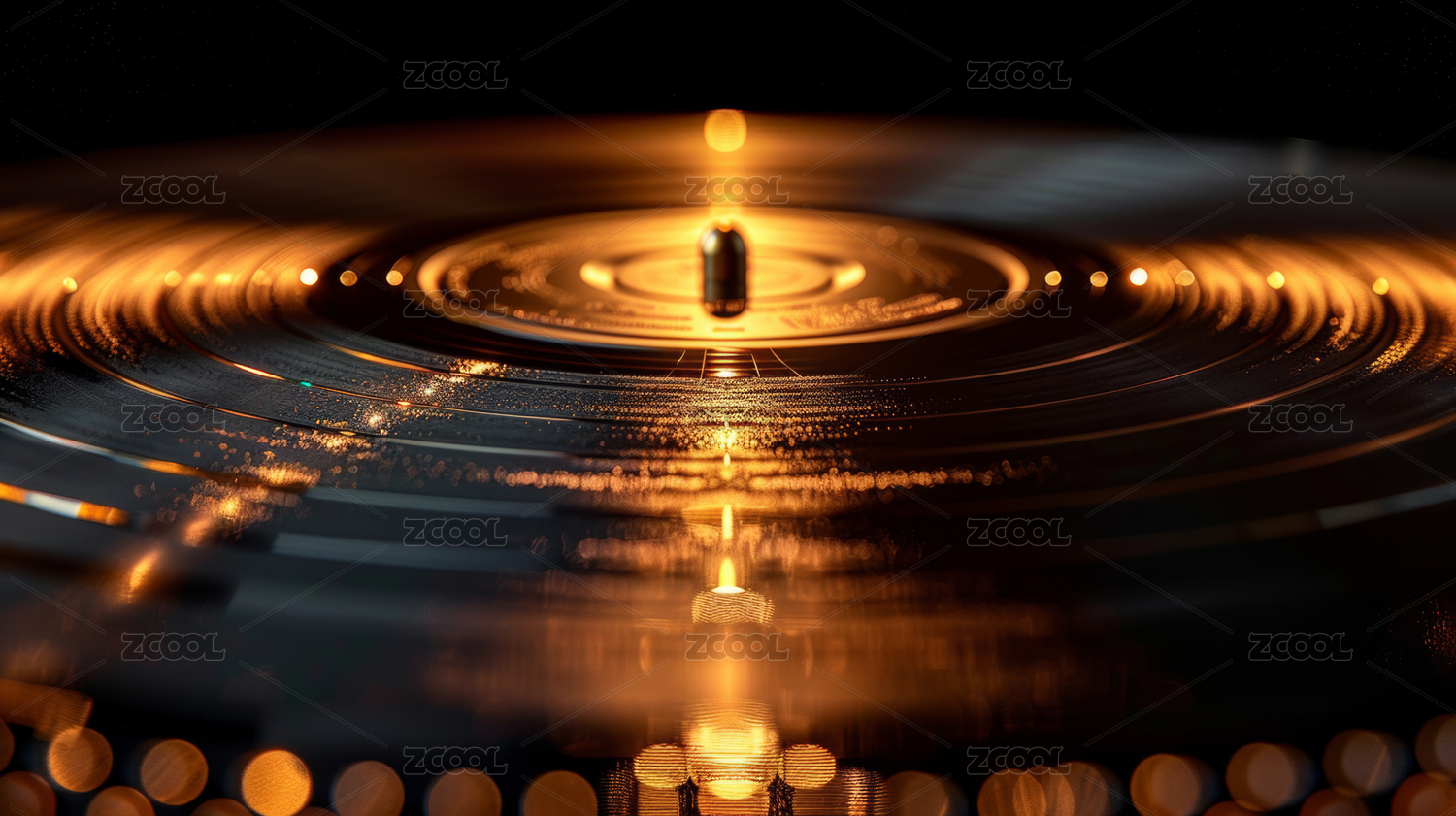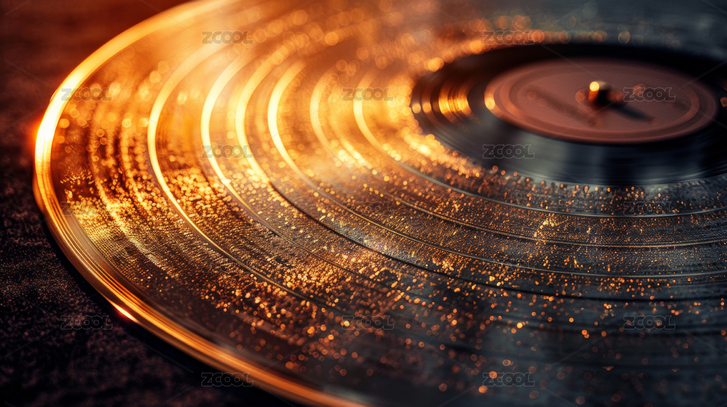 金色光影下的黑色光盤黑膠唱片特寫