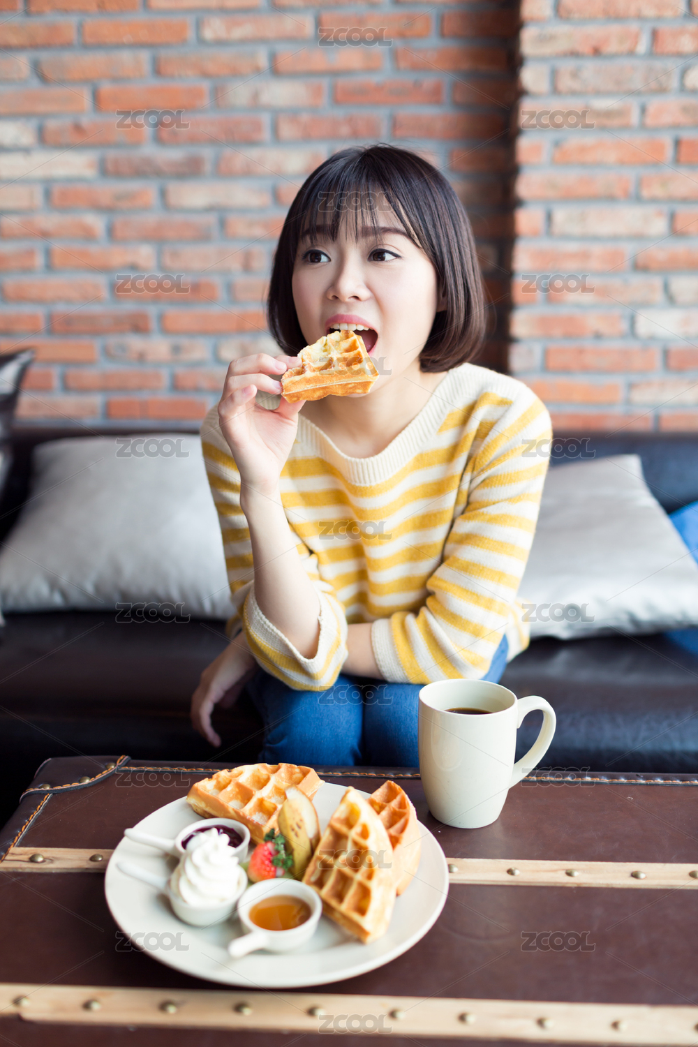 年輕女性坐在咖啡館里用餐,休閑的城市生活