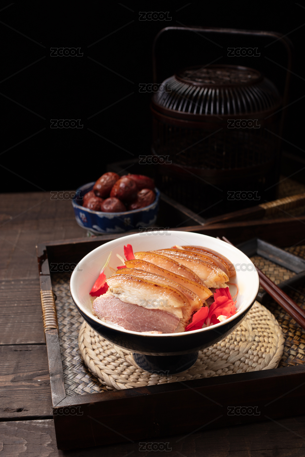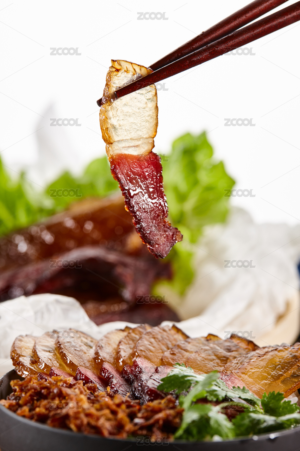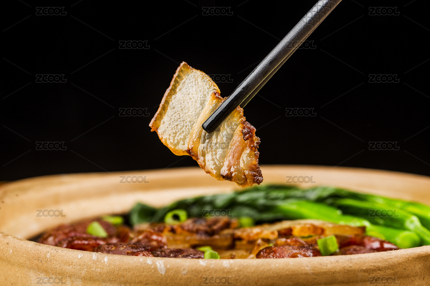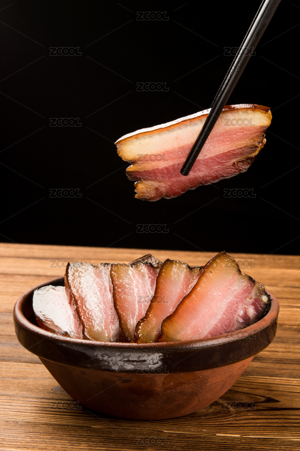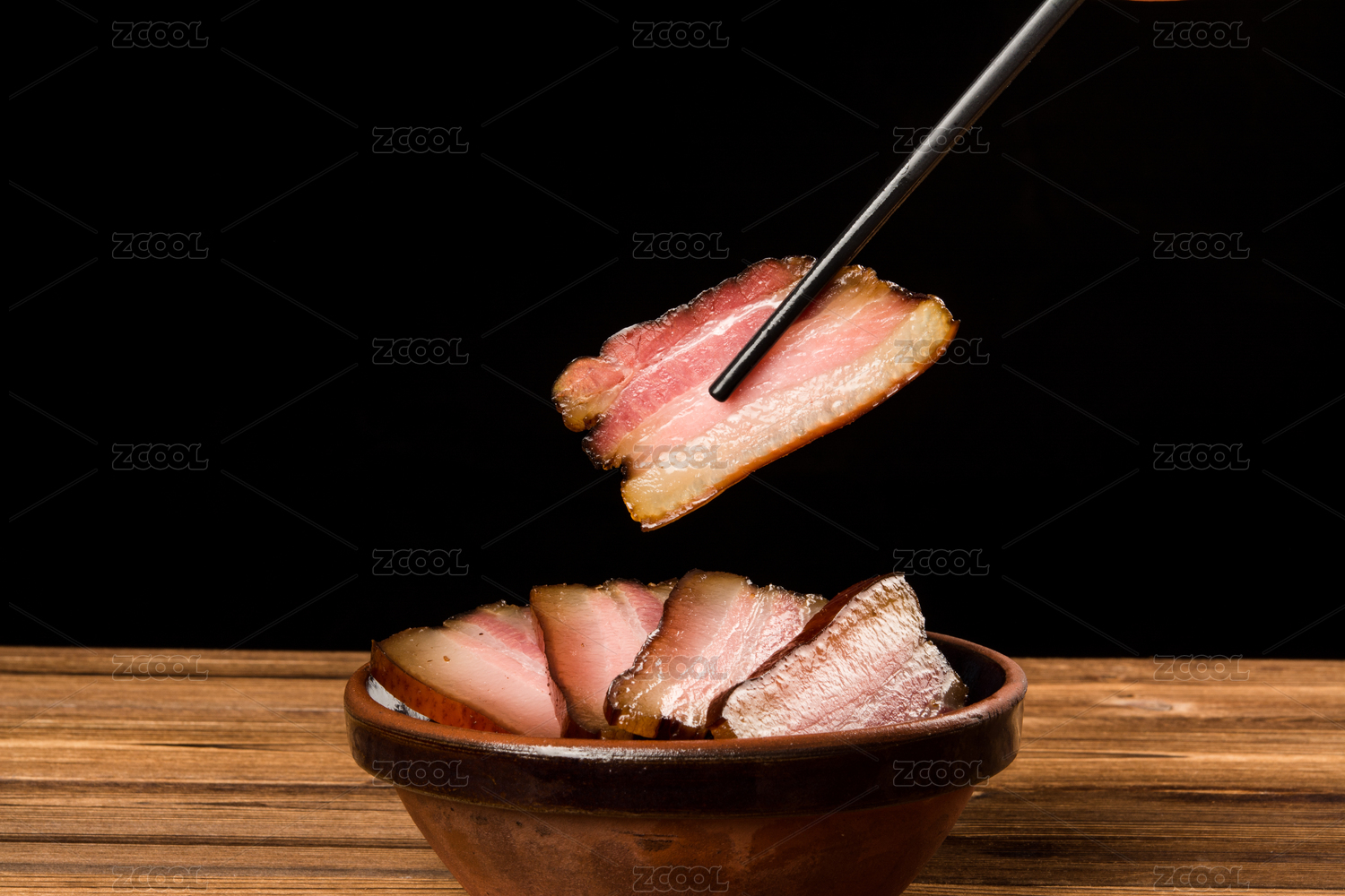 一碗切片的豬五花臘肉放在陶碗里面,一雙黑色的筷子夾起一片臘肉,黑色背景