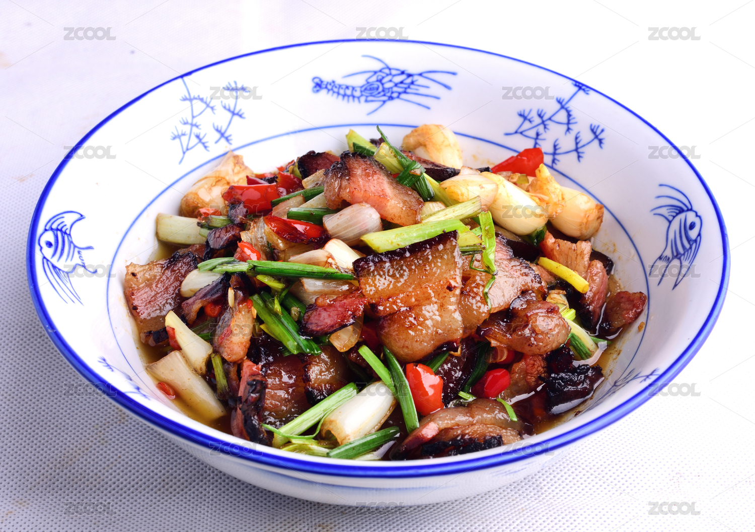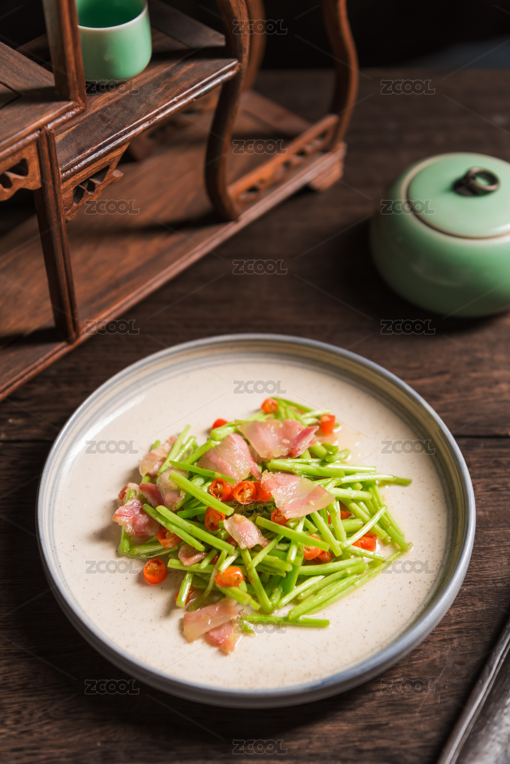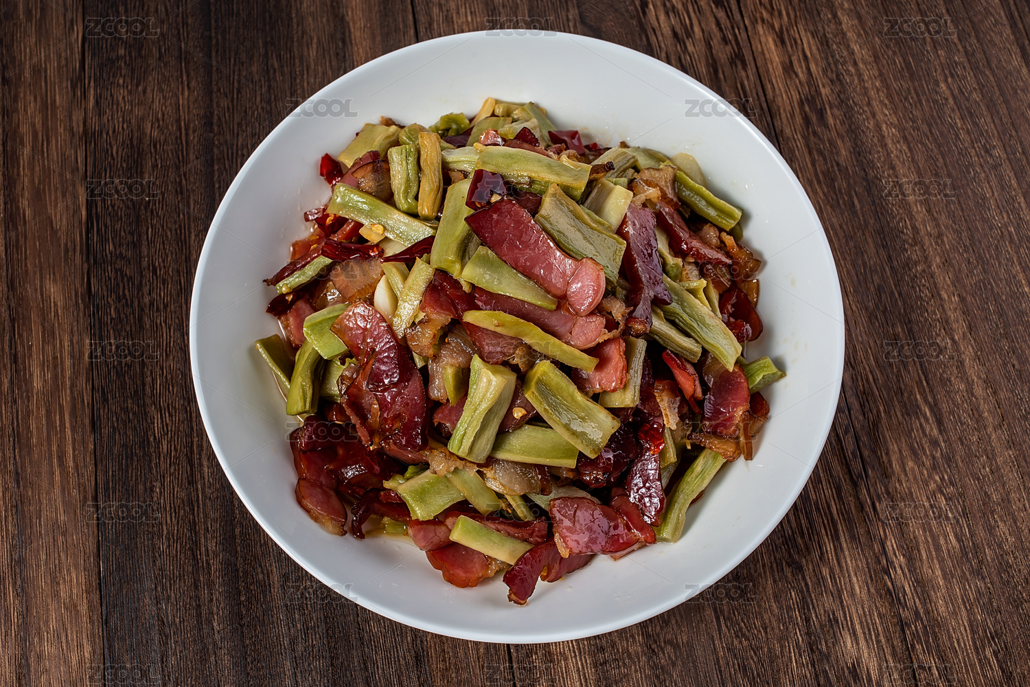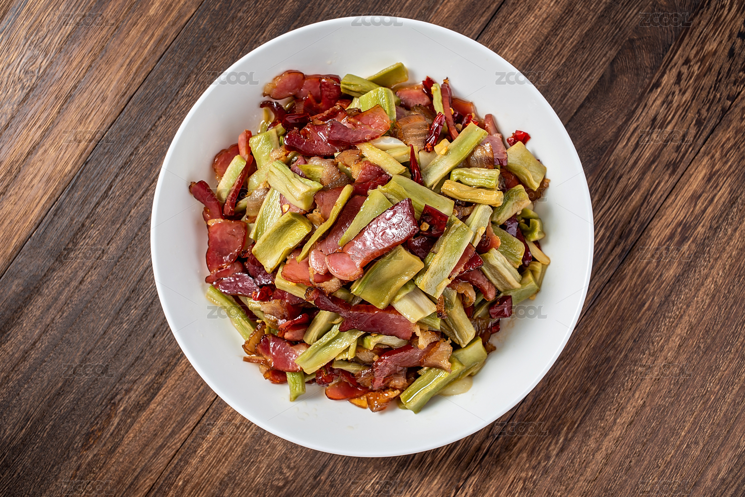 中國湘菜家常菜,一碟貢菜炒臘肉在木桌上