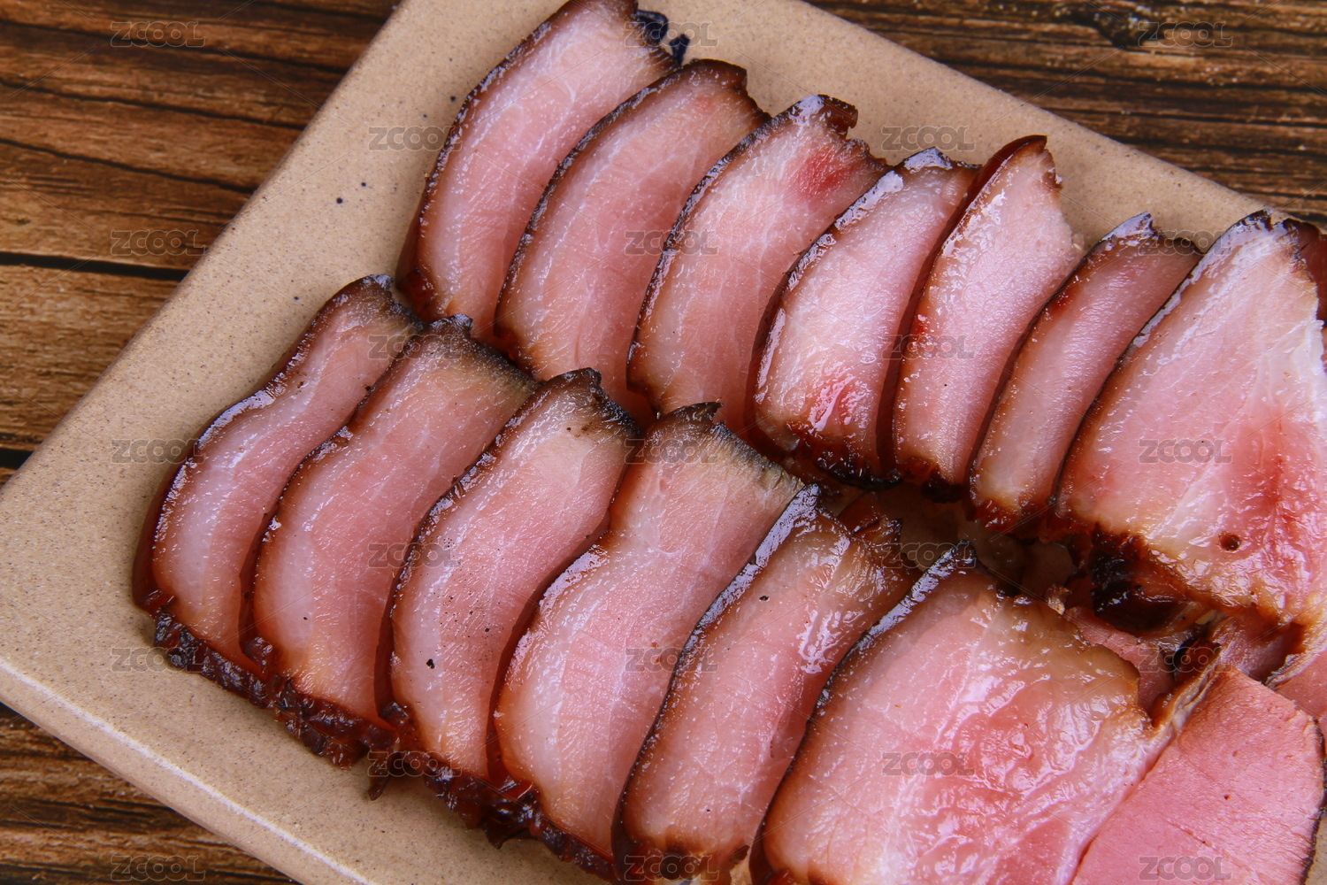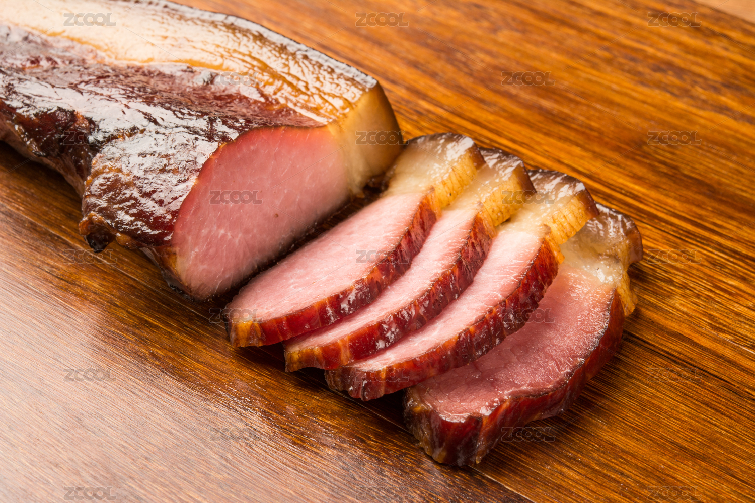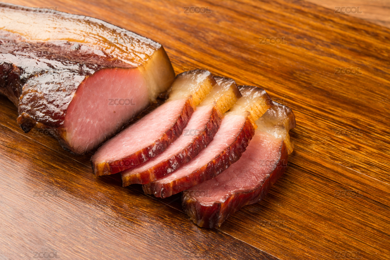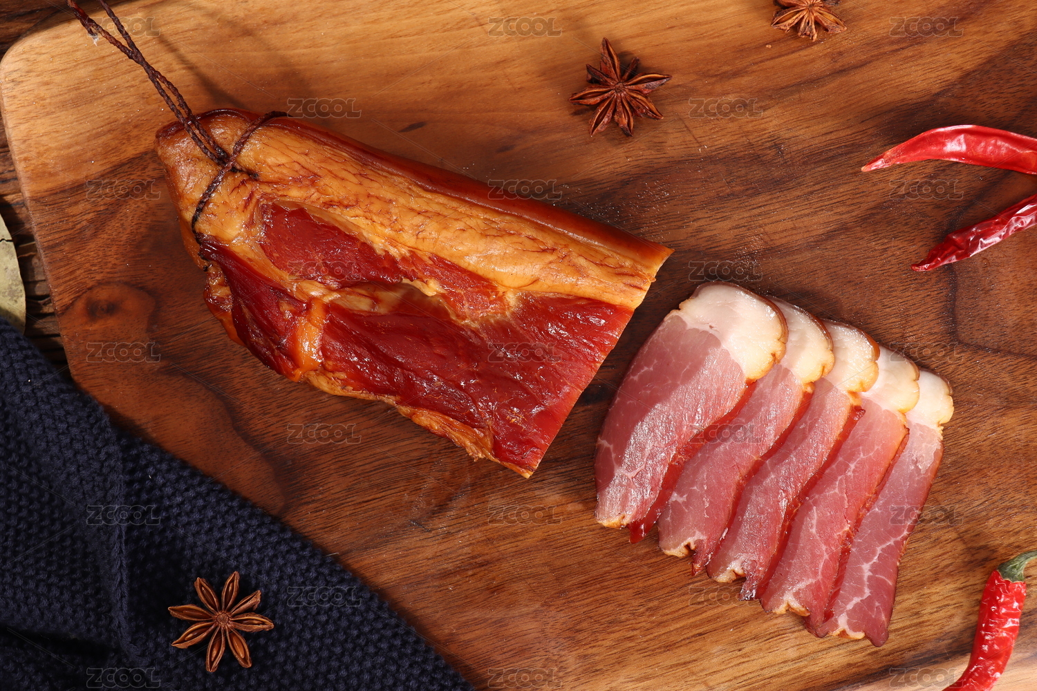 木砧板上放著一塊整的豬后腿臘肉和幾片切成片的豬后腿臘肉