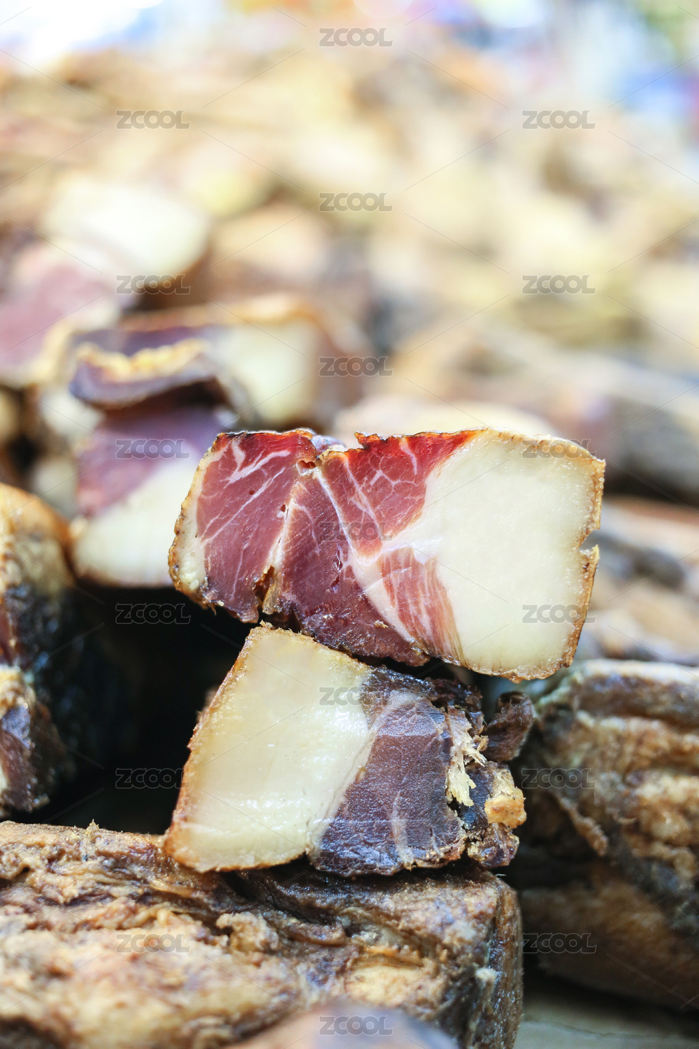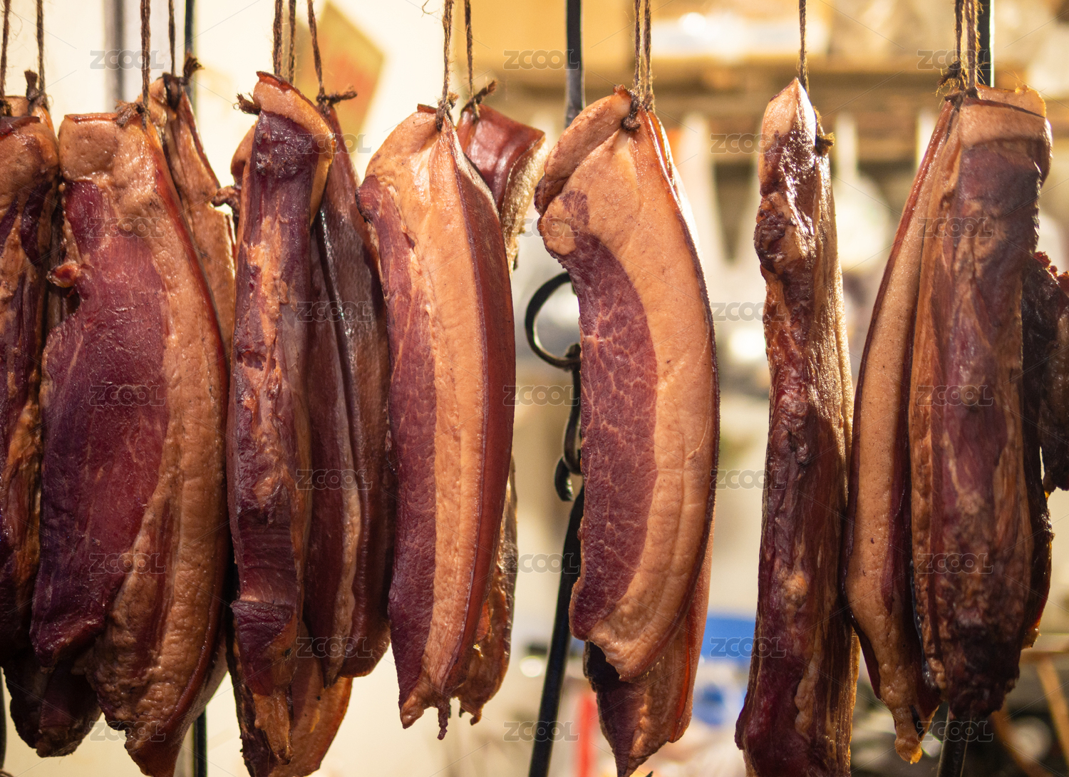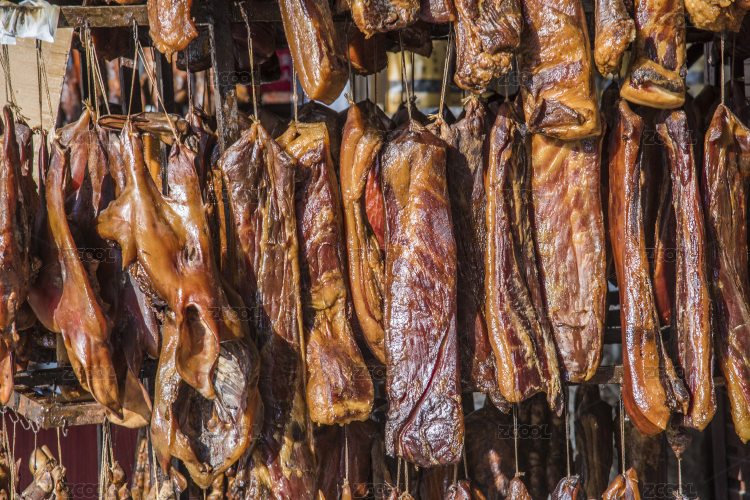 市場上懸掛售賣的中國傳統(tǒng)年貨腌制臘肉
