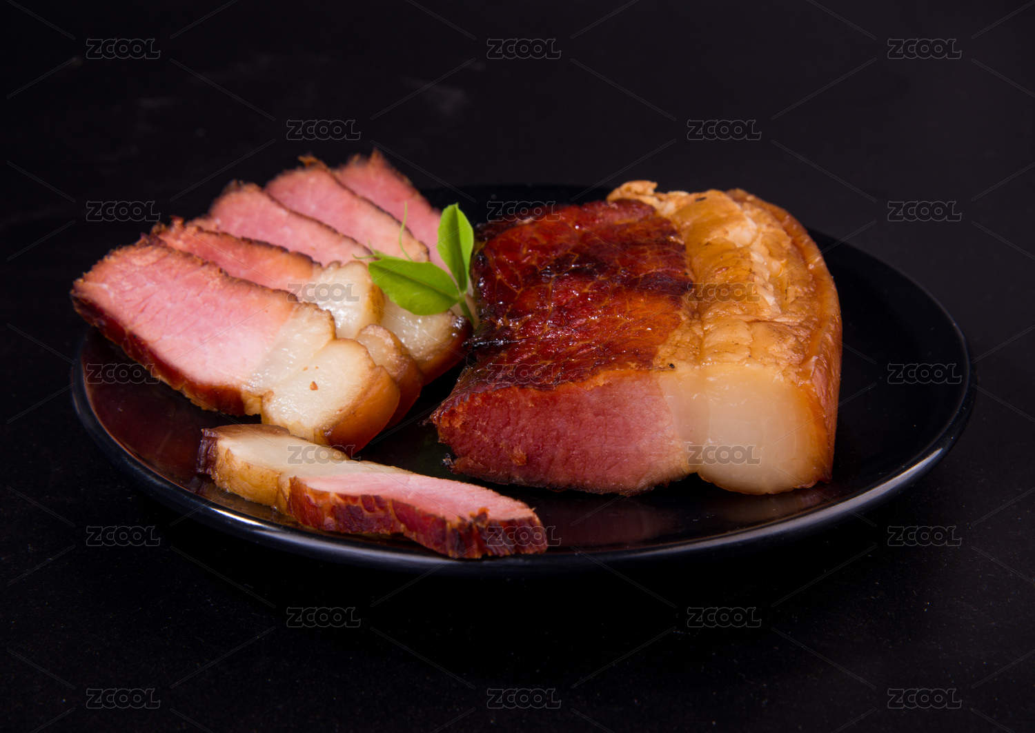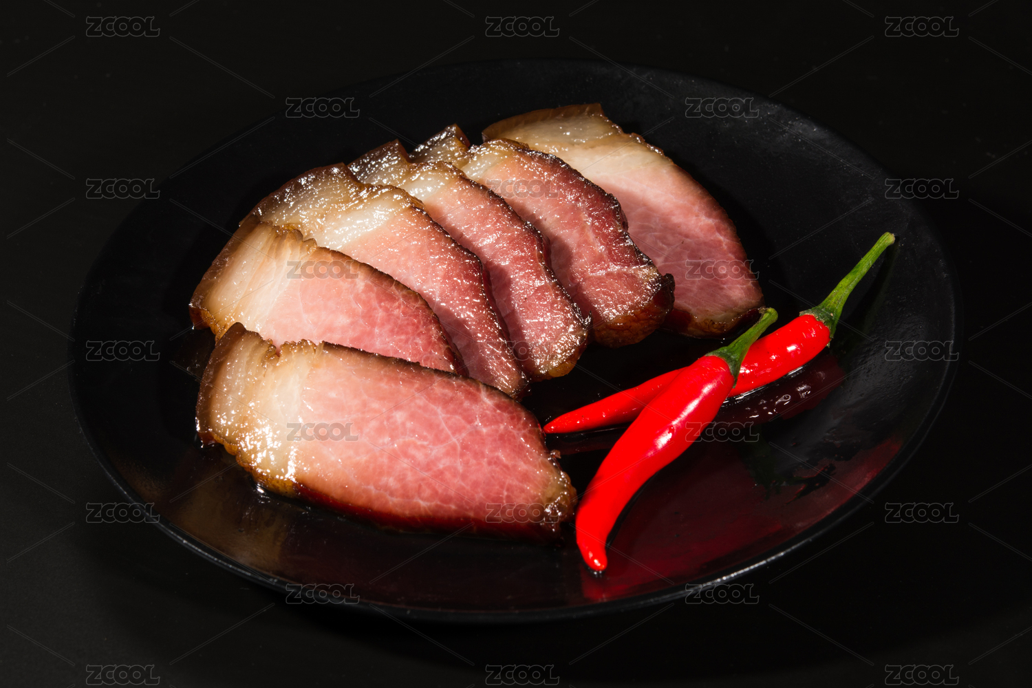 黑色盤子上面整齊地擺放著一些切片的豬后腿臘肉和兩個紅色小辣椒,黑色背景