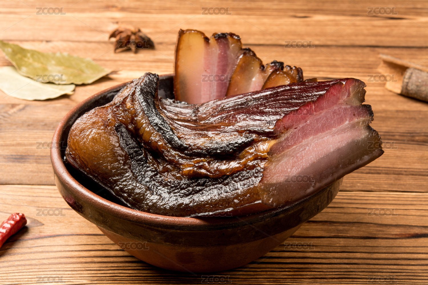 陶碗里面放著一塊豬五花臘肉和幾片切好的豬五花臘肉,四周還放著一些香葉、桂皮、辣椒干等香料,木紋背景.