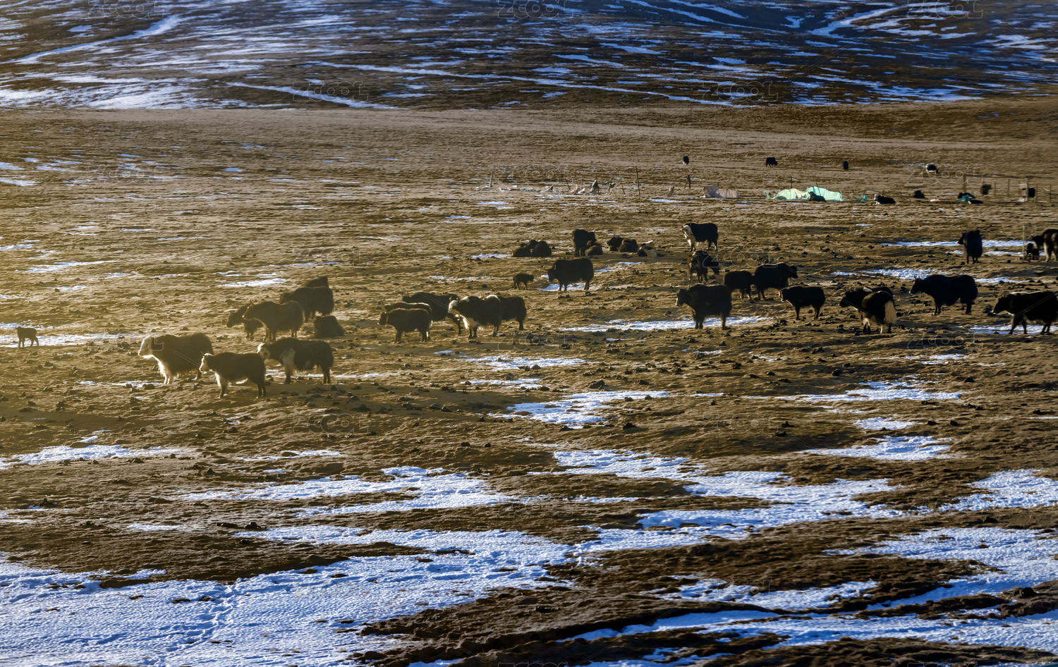 中國西藏青藏鐵路沿線風(fēng)光清晨陽光下牦牛群