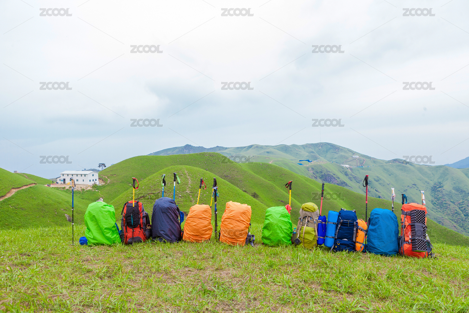 山頂排列整齊的徒步雙肩包