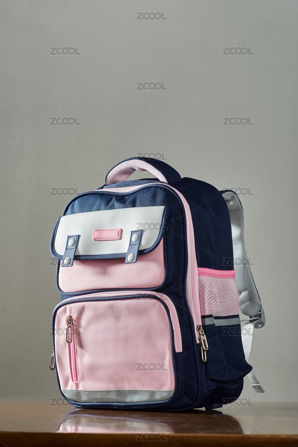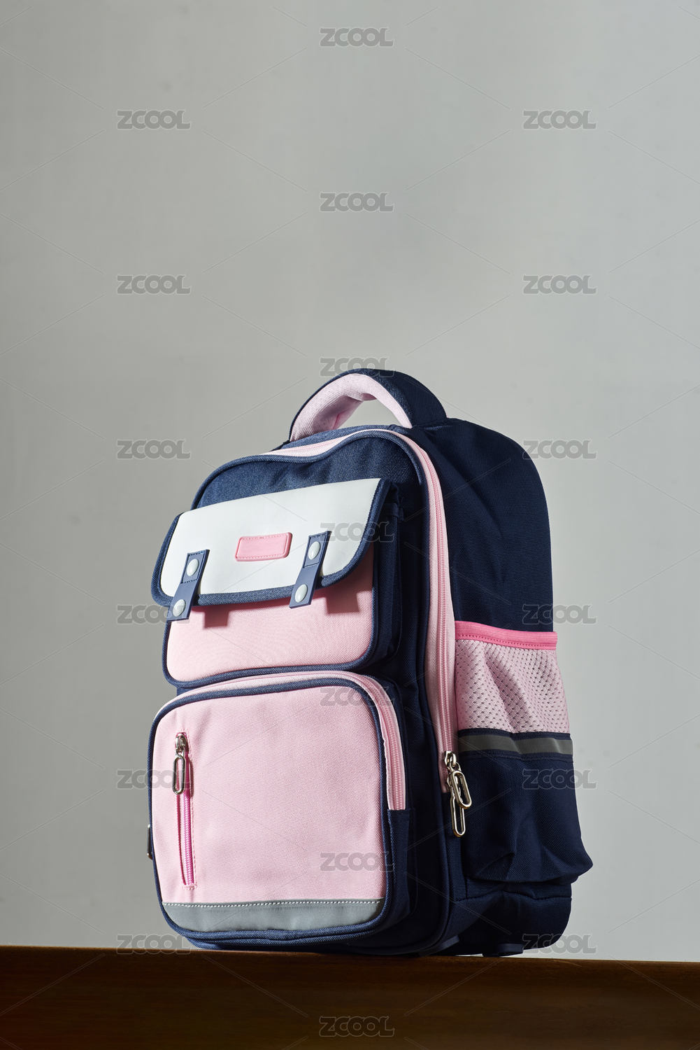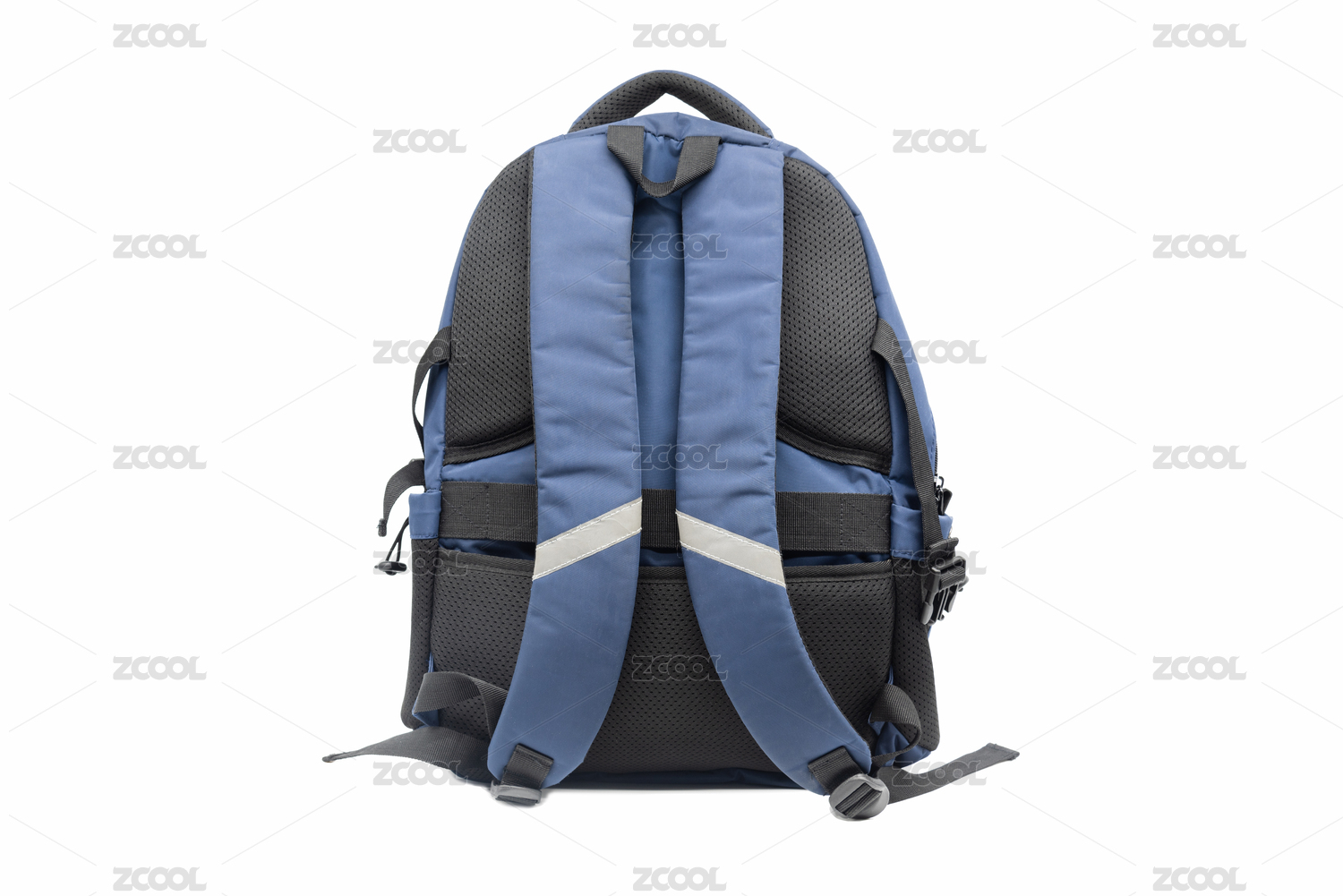 白底一組男士藍(lán)色雙肩包特寫