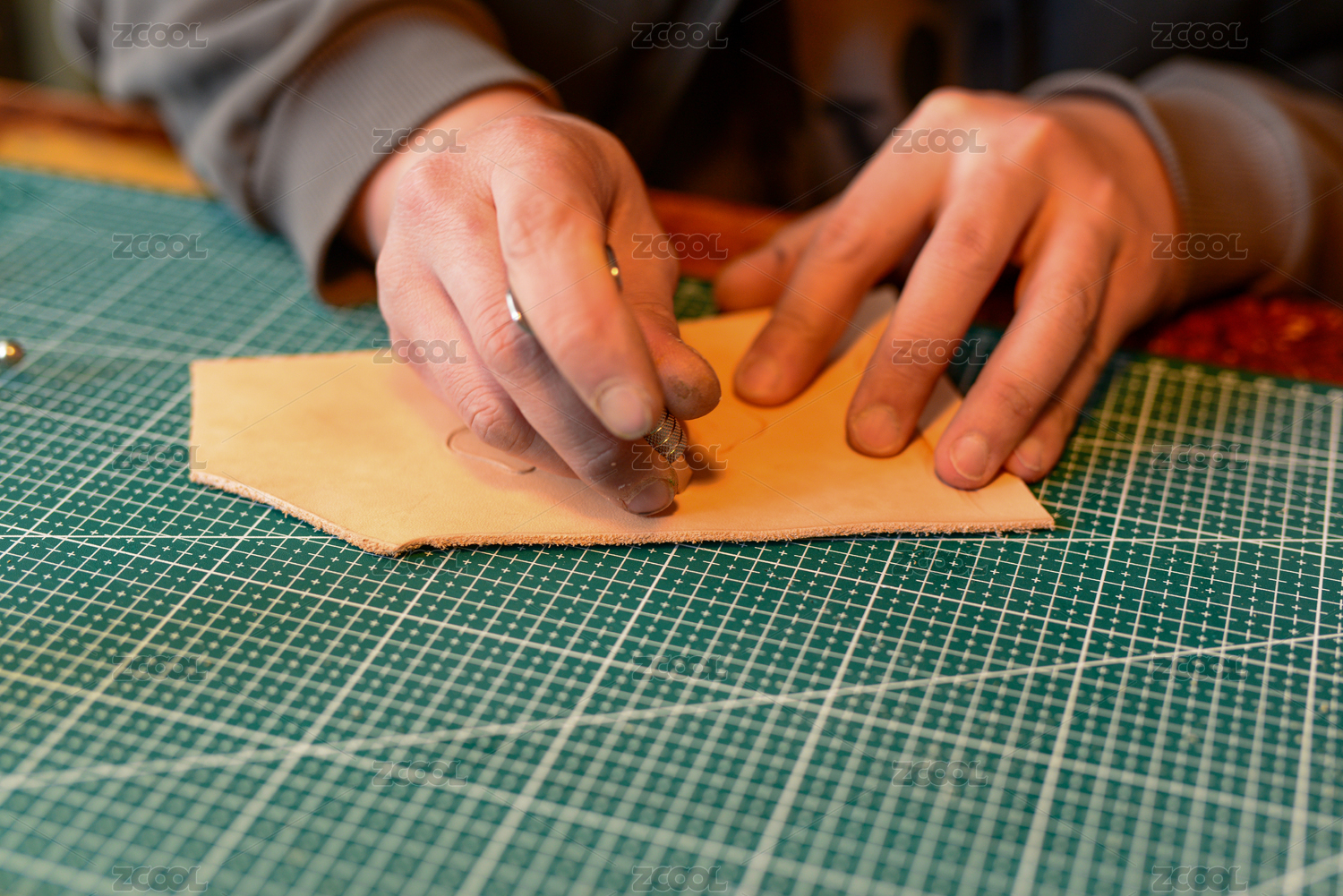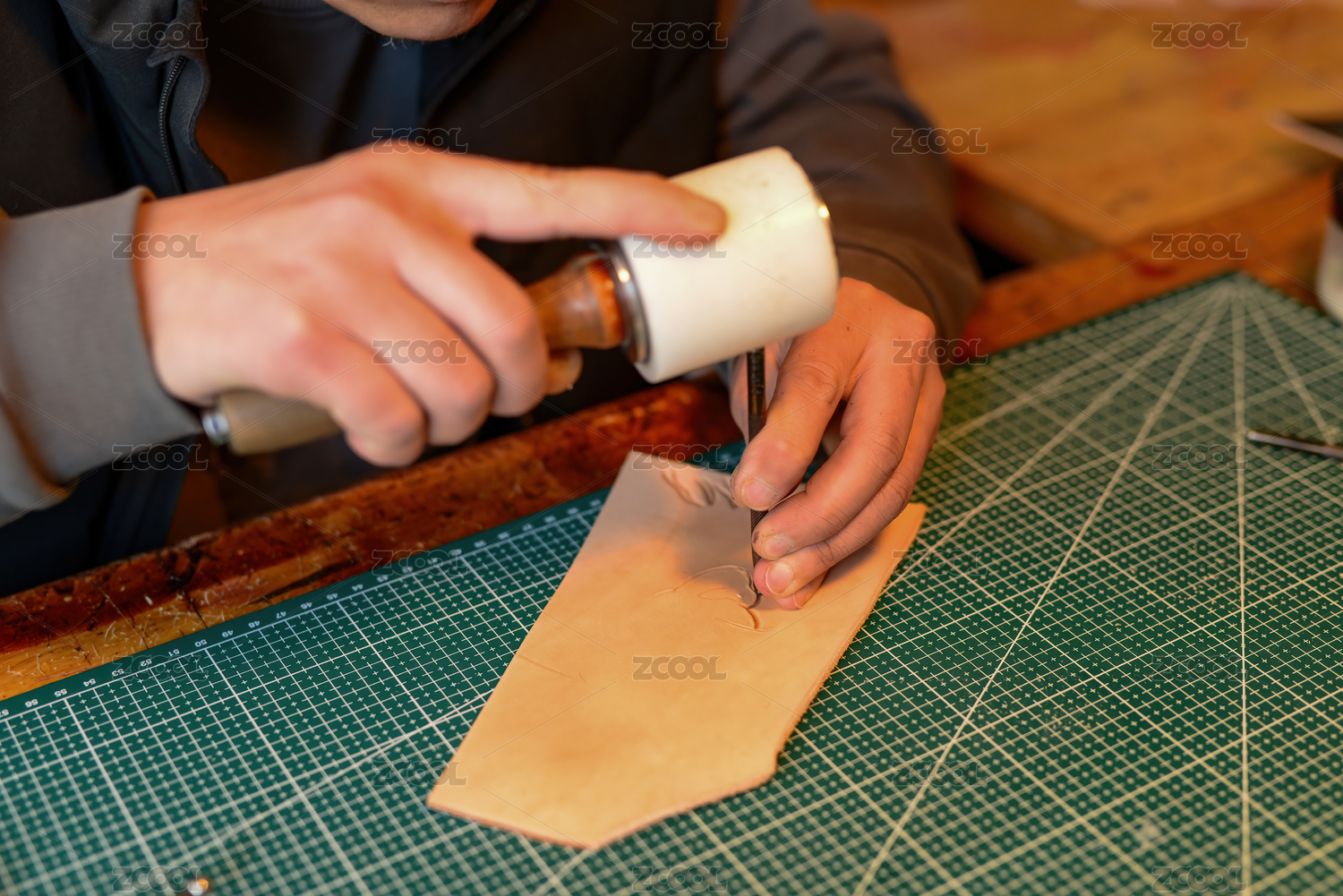 皮具工匠在給牛皮植鞣革上沖壓花紋