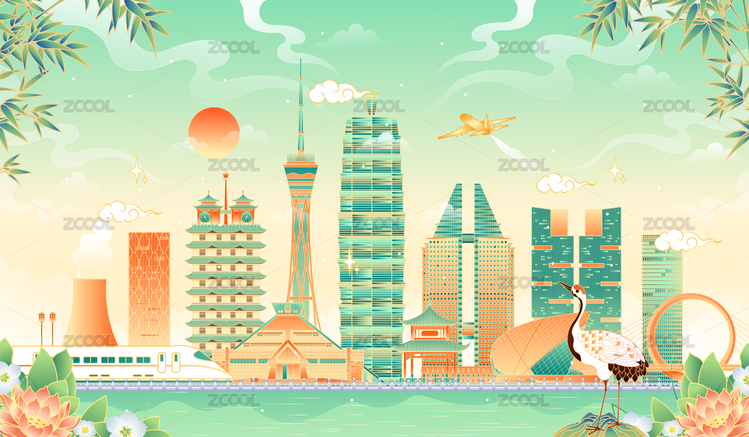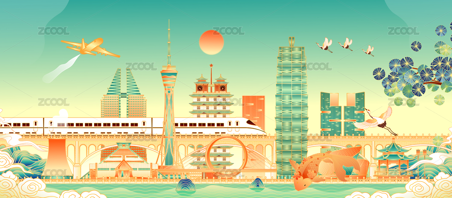 鄭州地標(biāo)建筑群矢量節(jié)日插畫復(fù)古風(fēng)