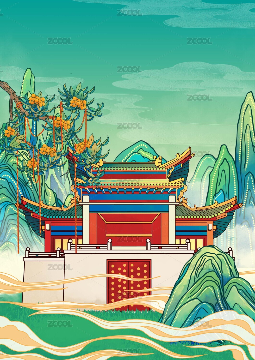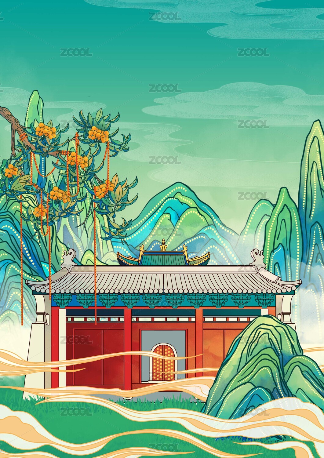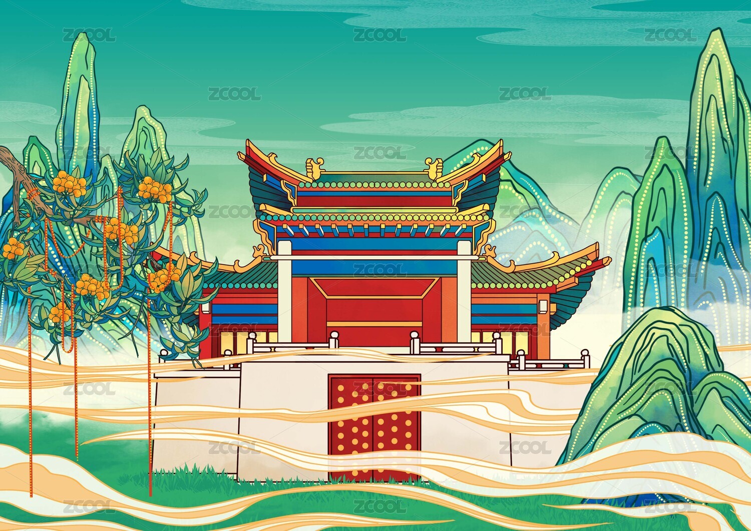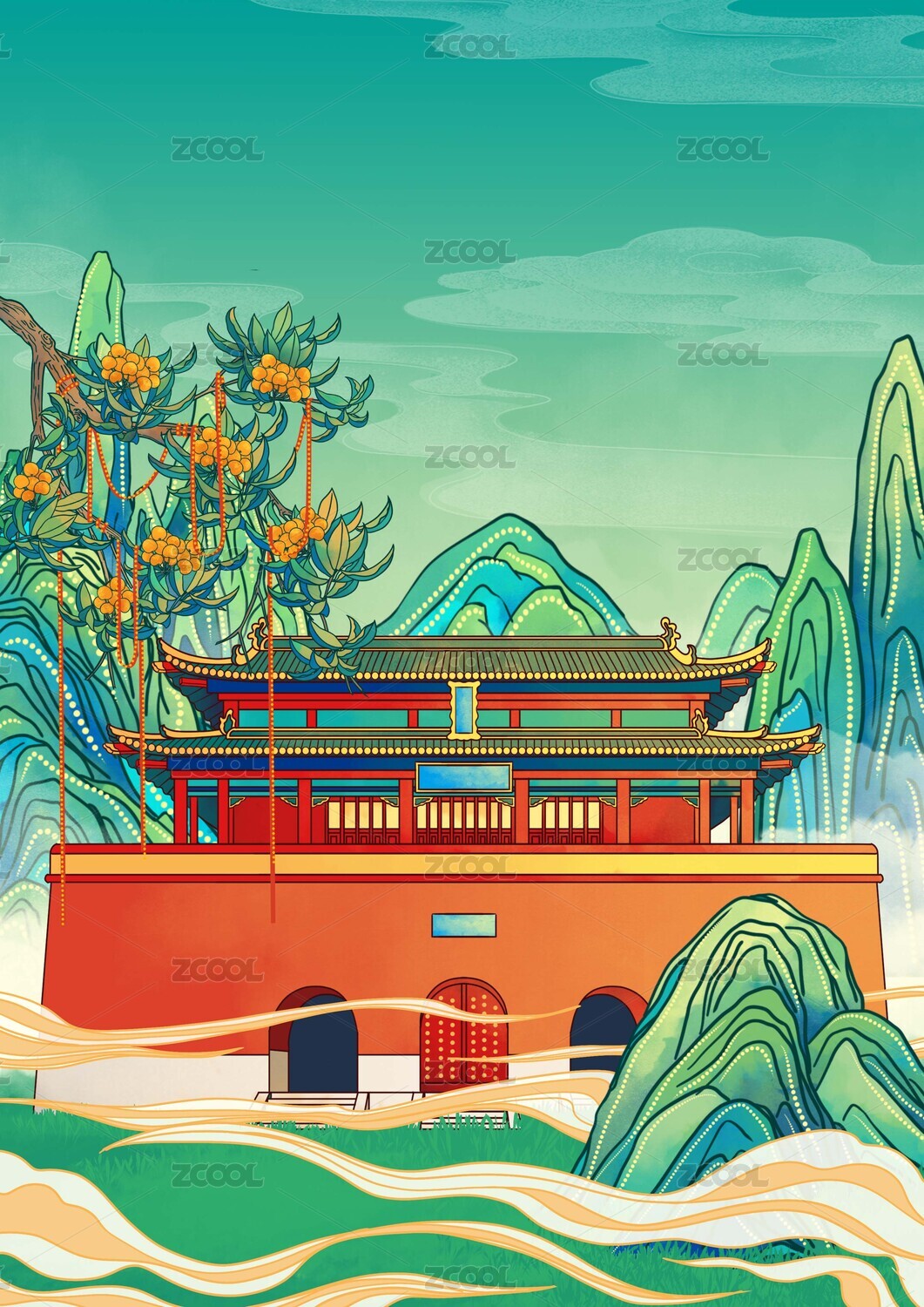鄭州地標(biāo)古建筑國風(fēng)插畫中岳廟