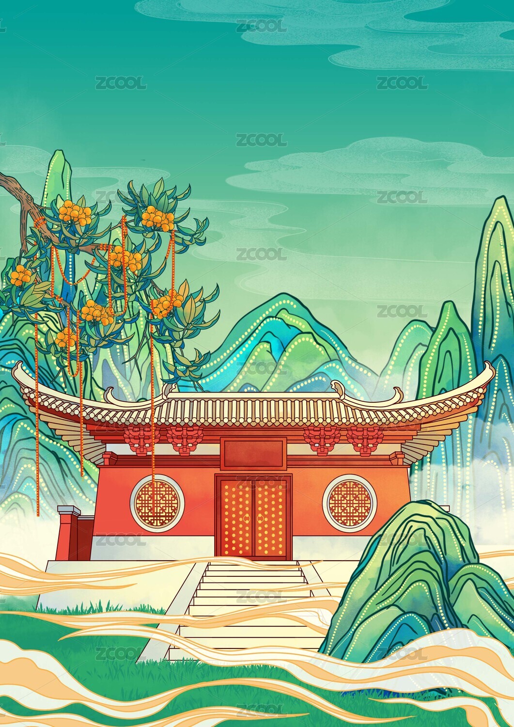 鄭州地標(biāo)古建筑國風(fēng)插畫嵩山少林寺