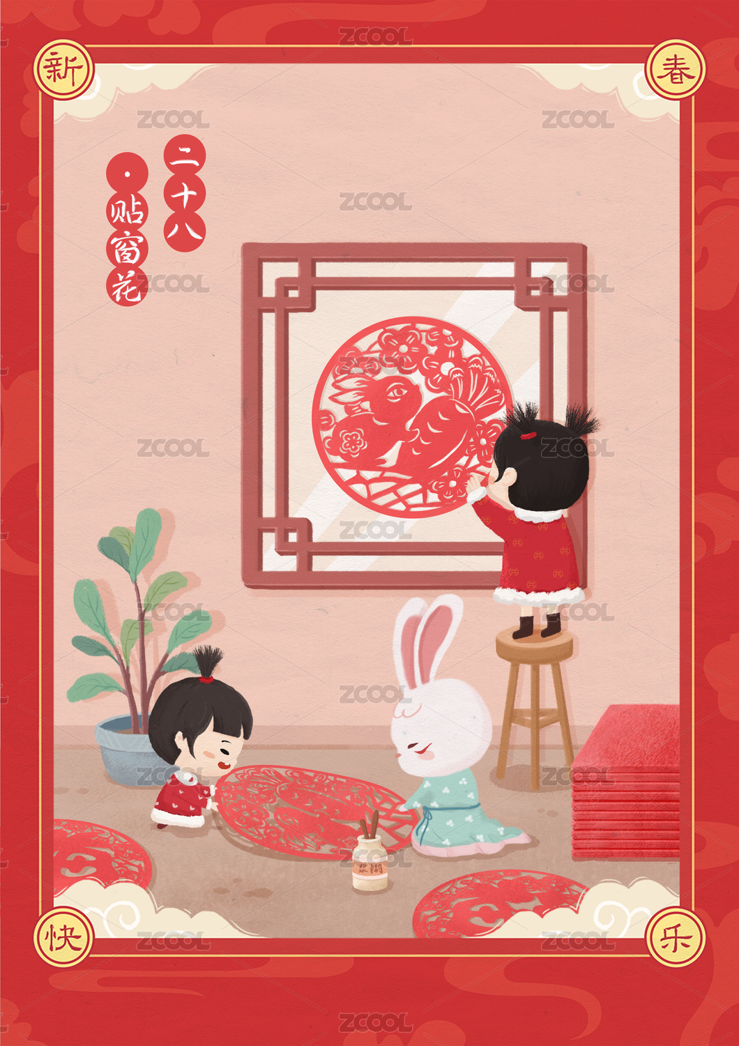 臘月二十八貼窗花兔年年俗插畫