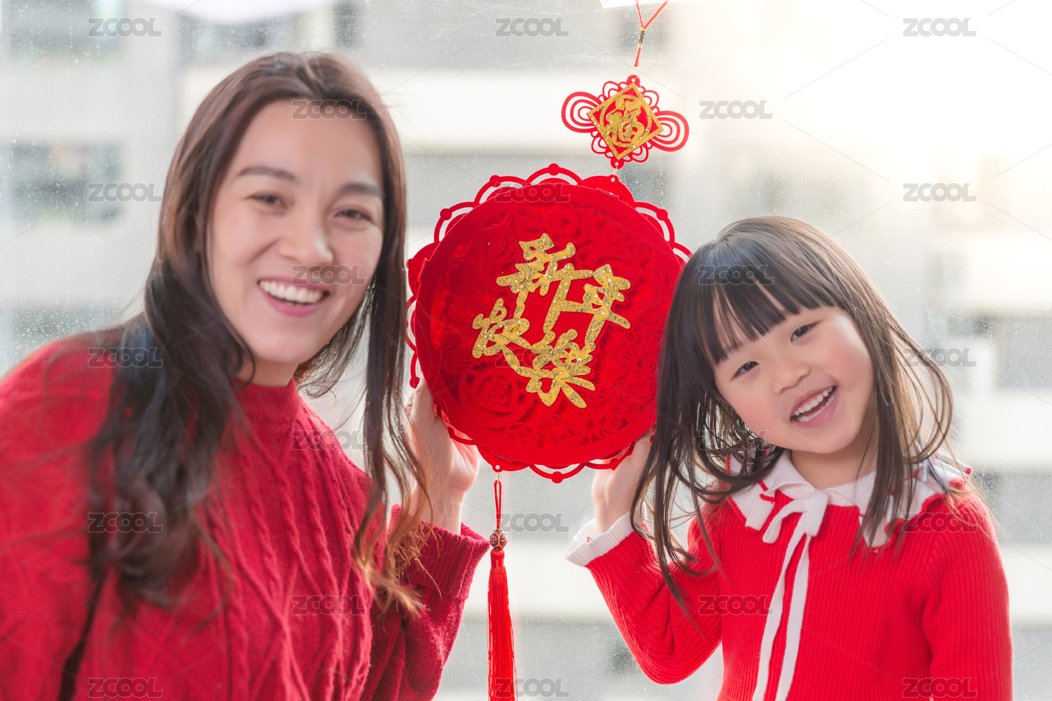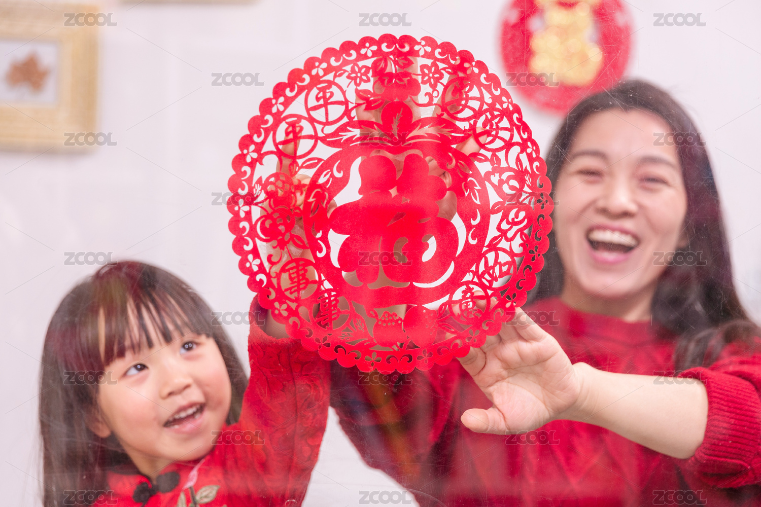 過年時母女一起開心貼窗花