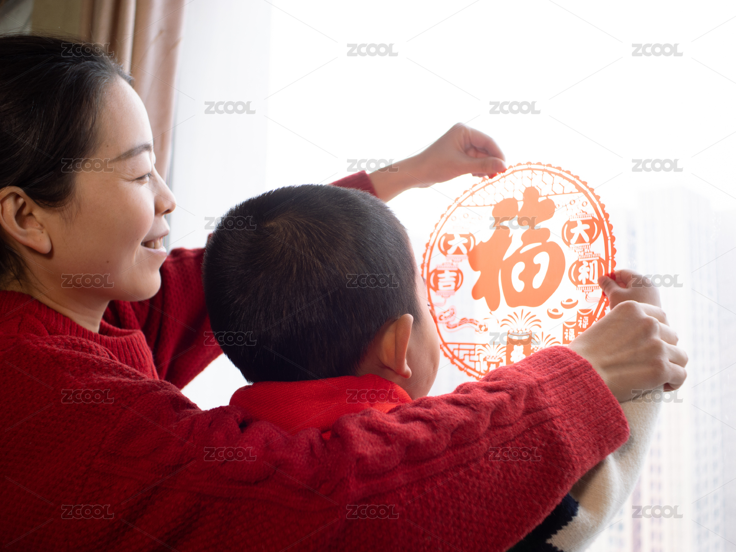 中國母子春節(jié)貼窗花