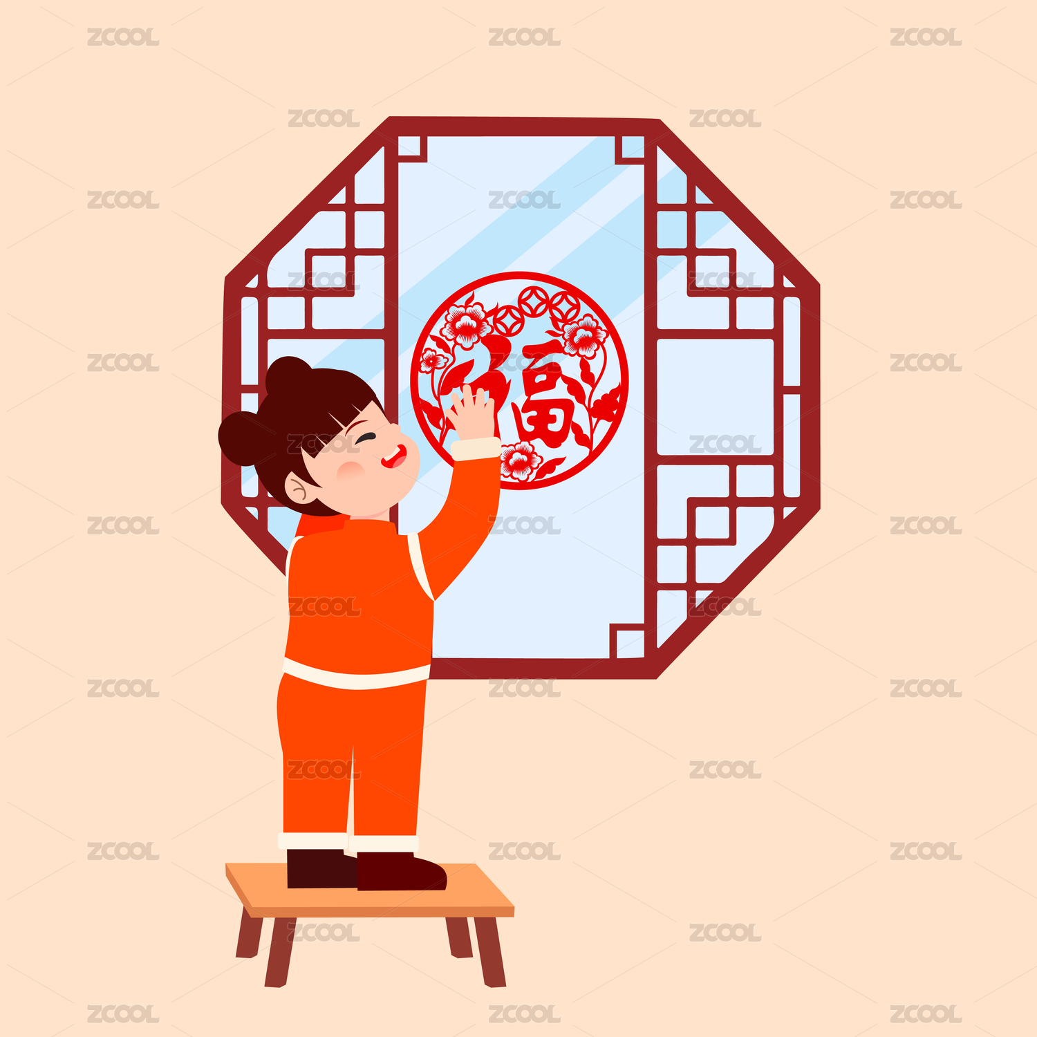 貼窗花的小女孩矢量插畫