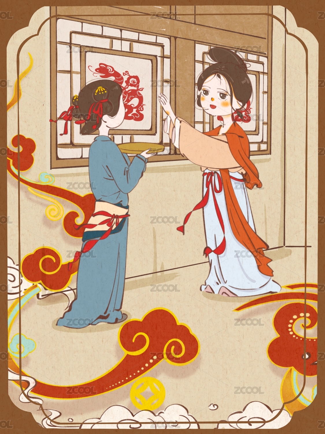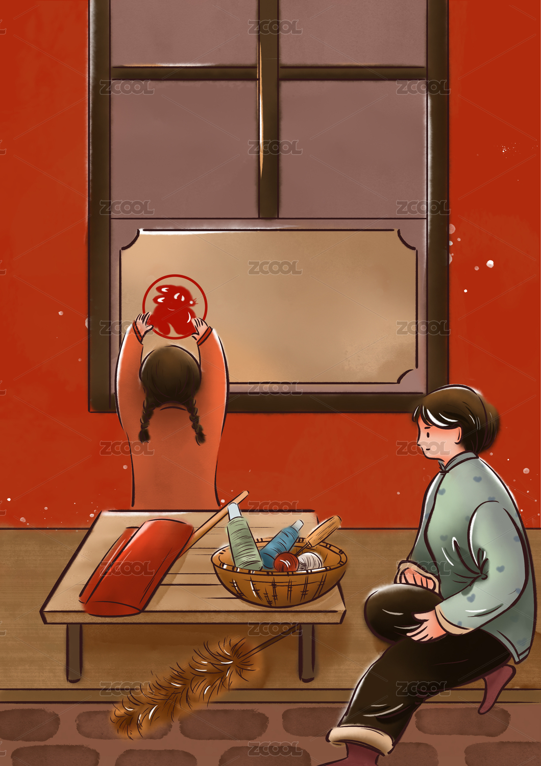 古風(fēng)過年女性貼窗花插畫