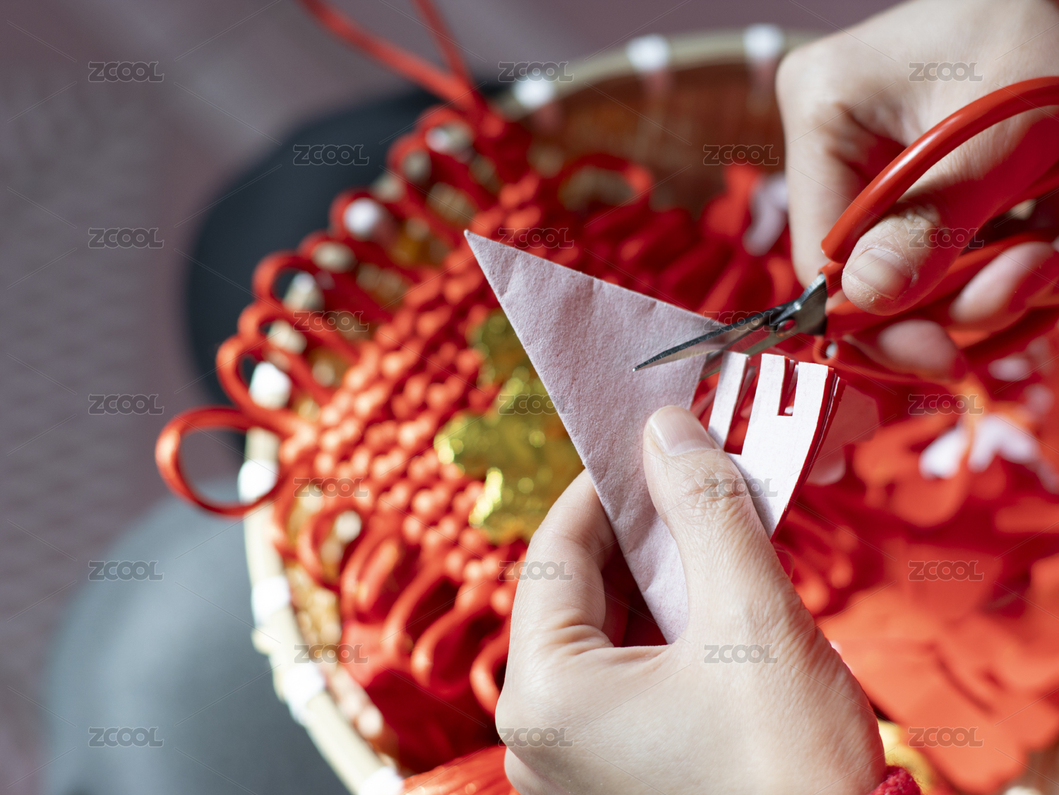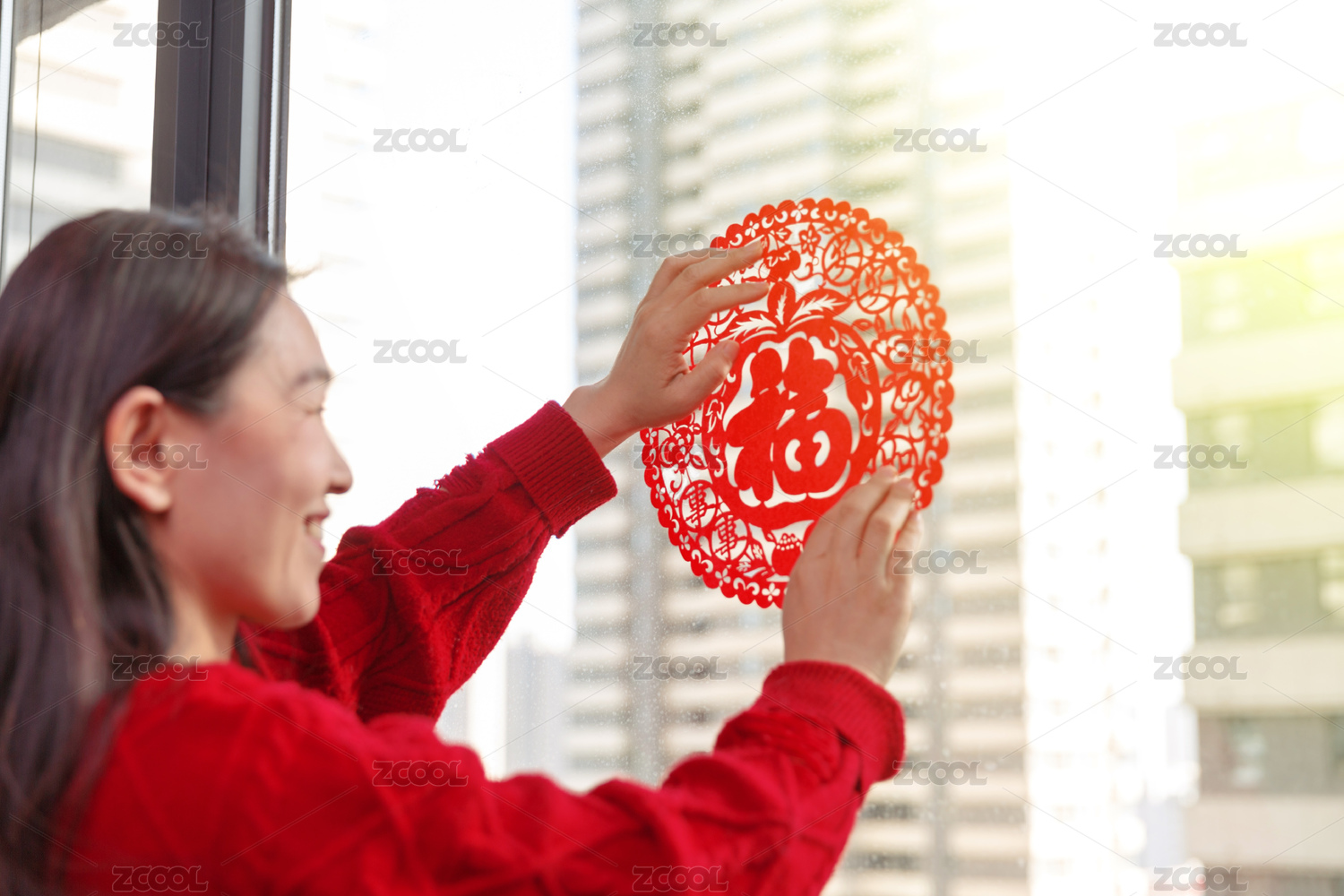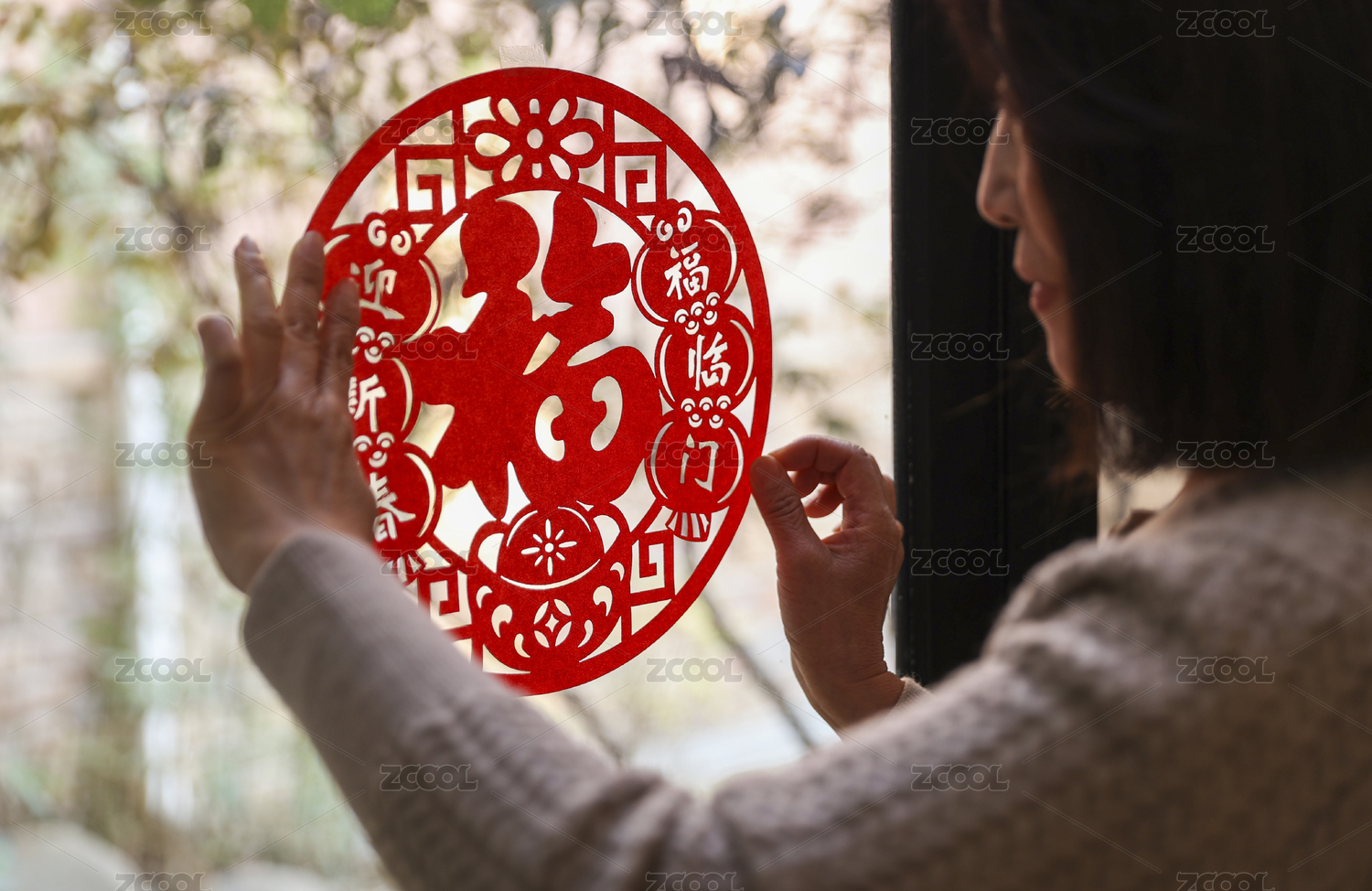 過春節(jié)時東方女性在貼窗花