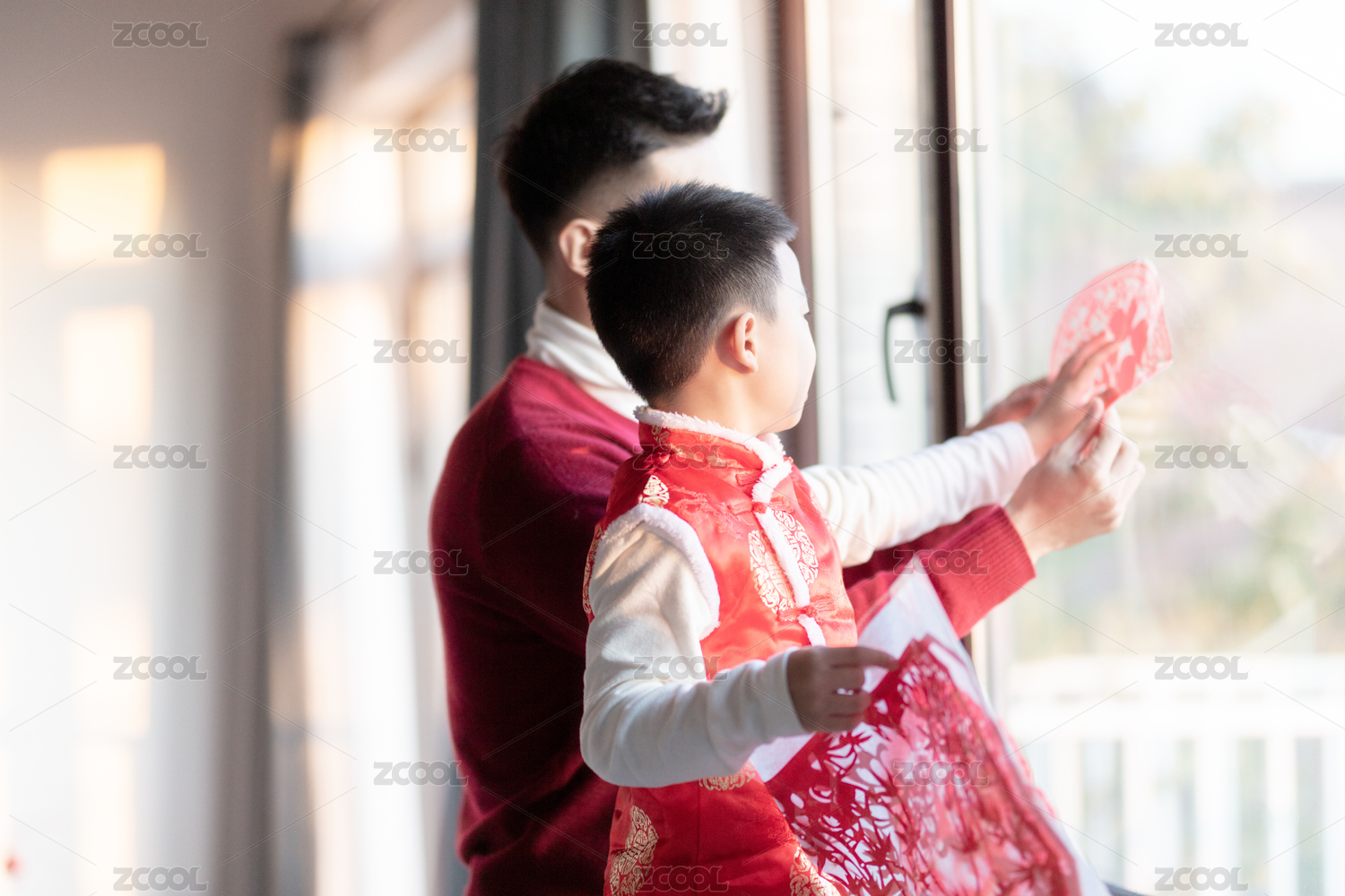 年輕的爸爸和兒子在貼窗花
