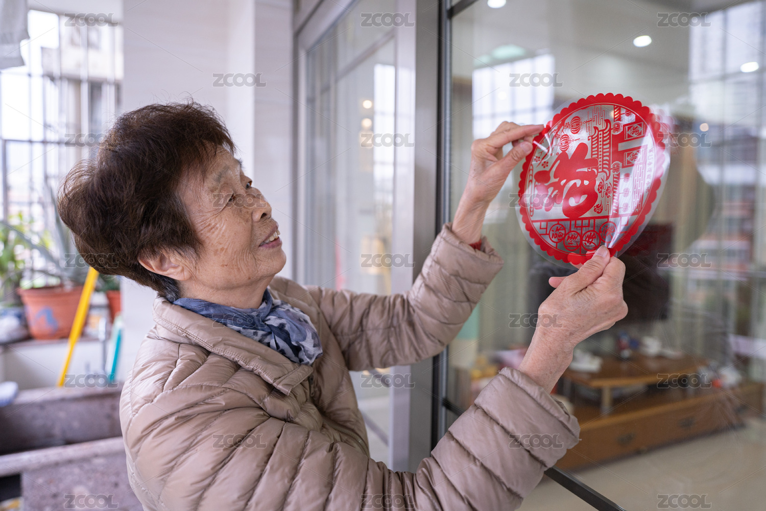 一名中國老年人正在玻璃床上貼窗花迎接春節(jié)