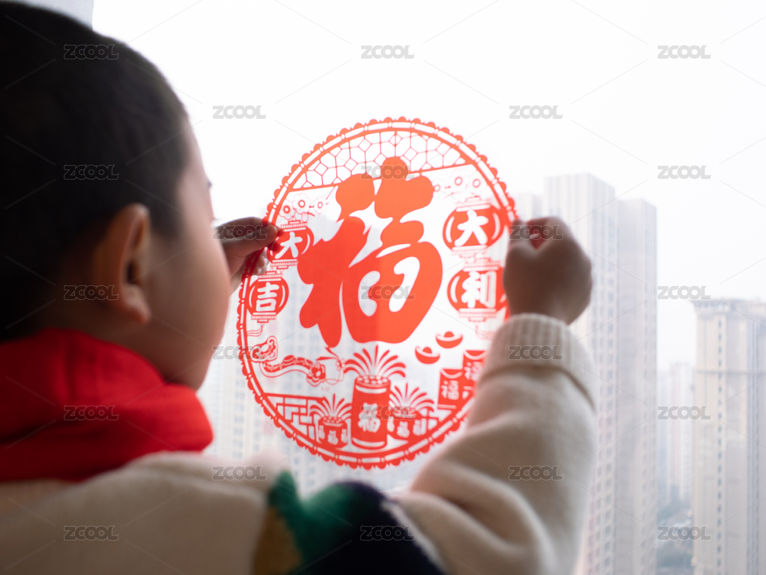 過新年在家窗戶上貼窗花的小女孩