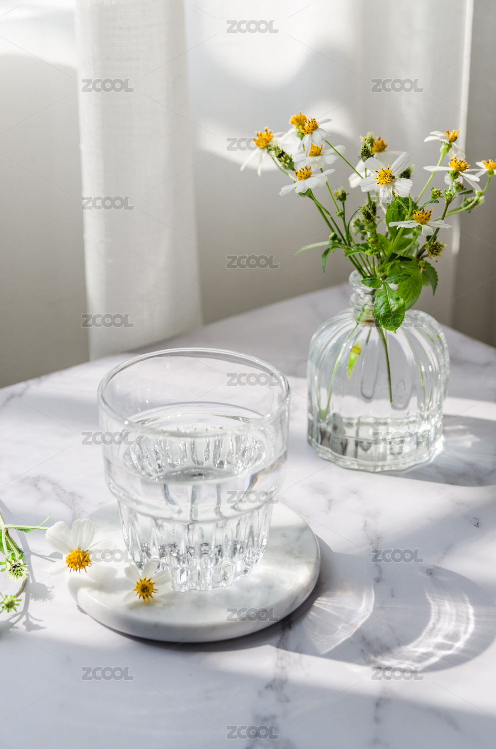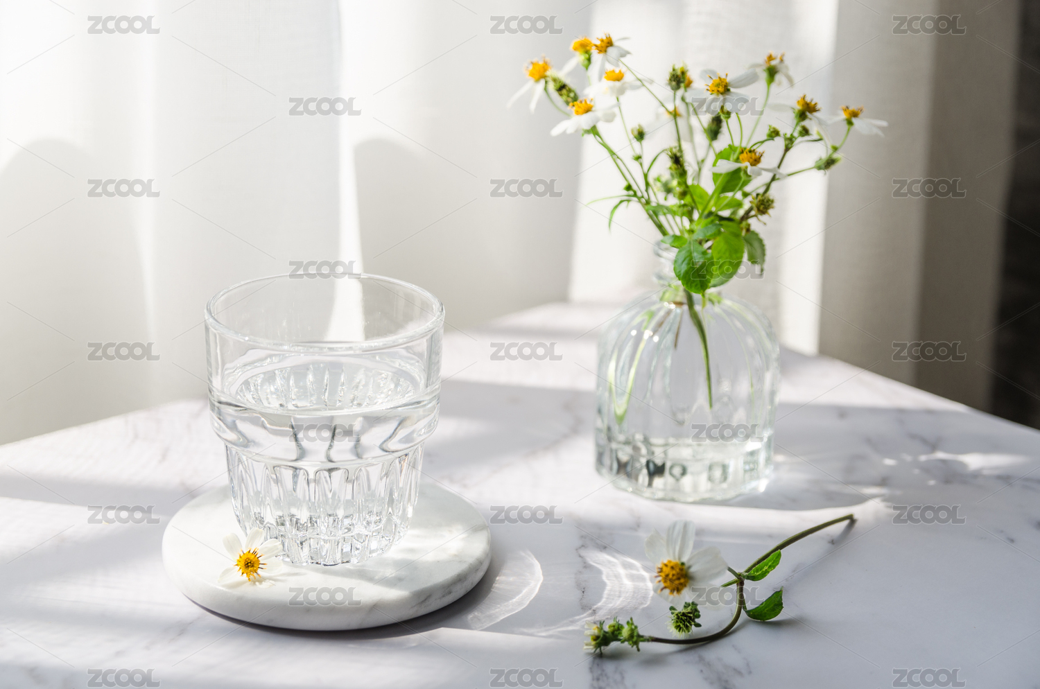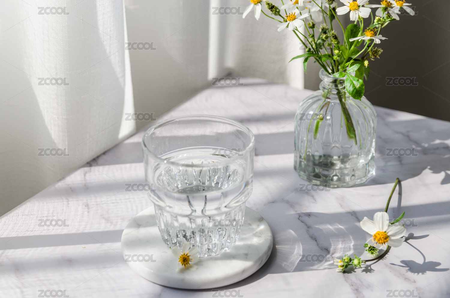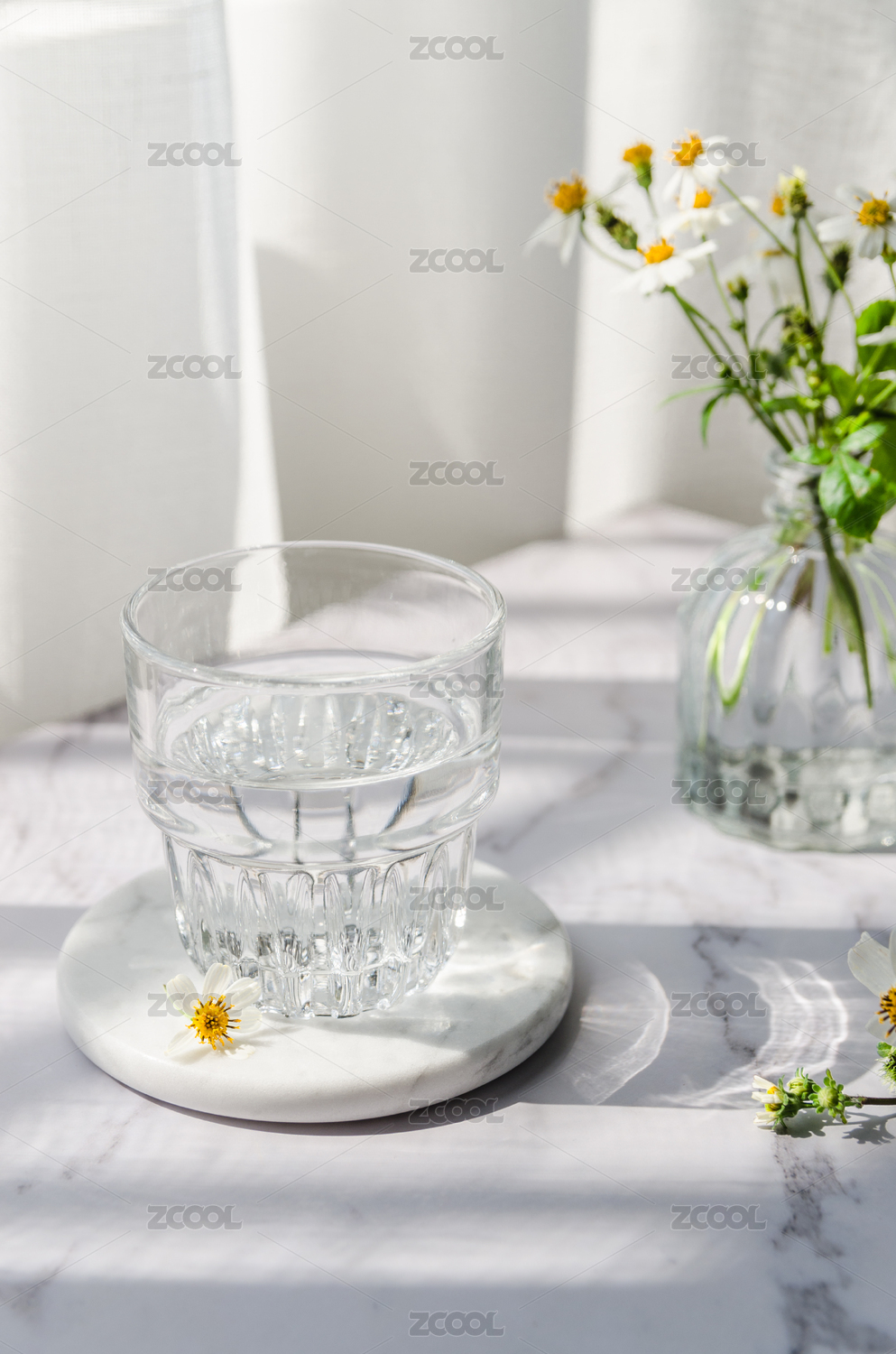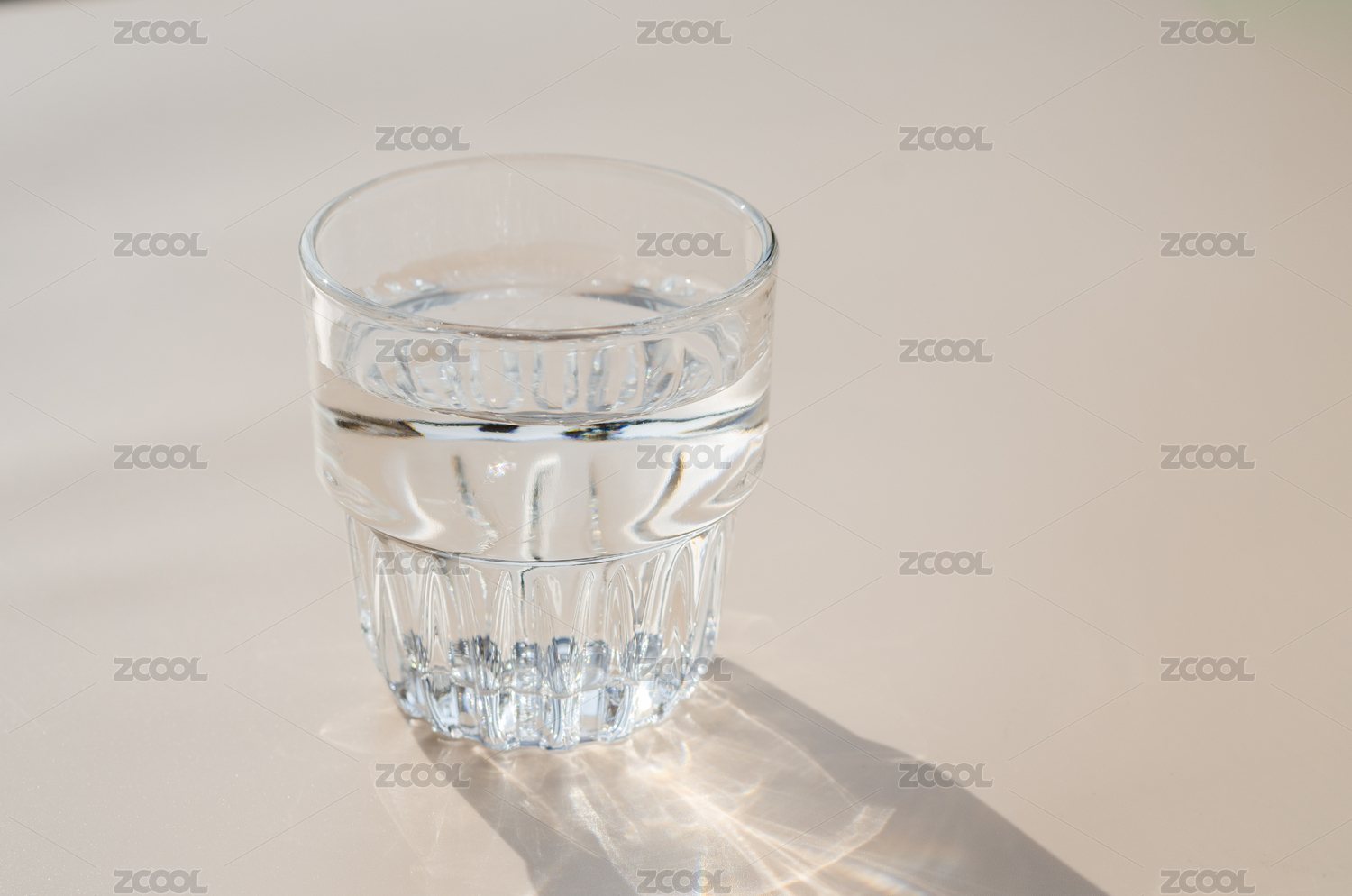 玻璃杯裝著純凈水放在陽光下