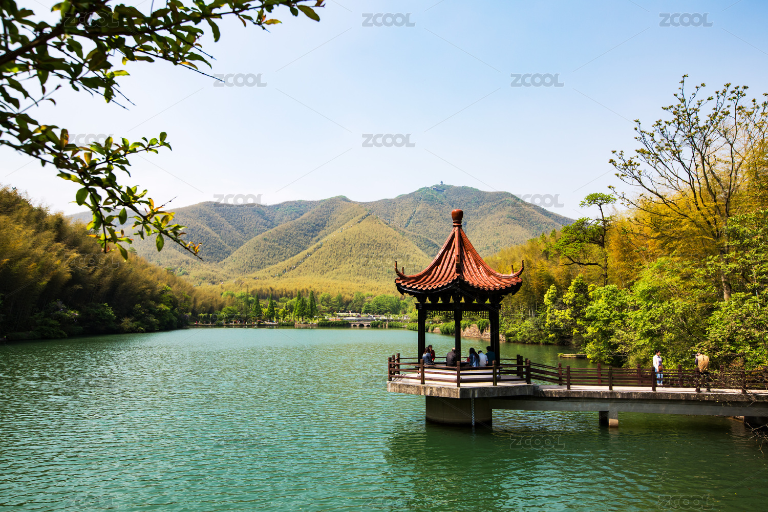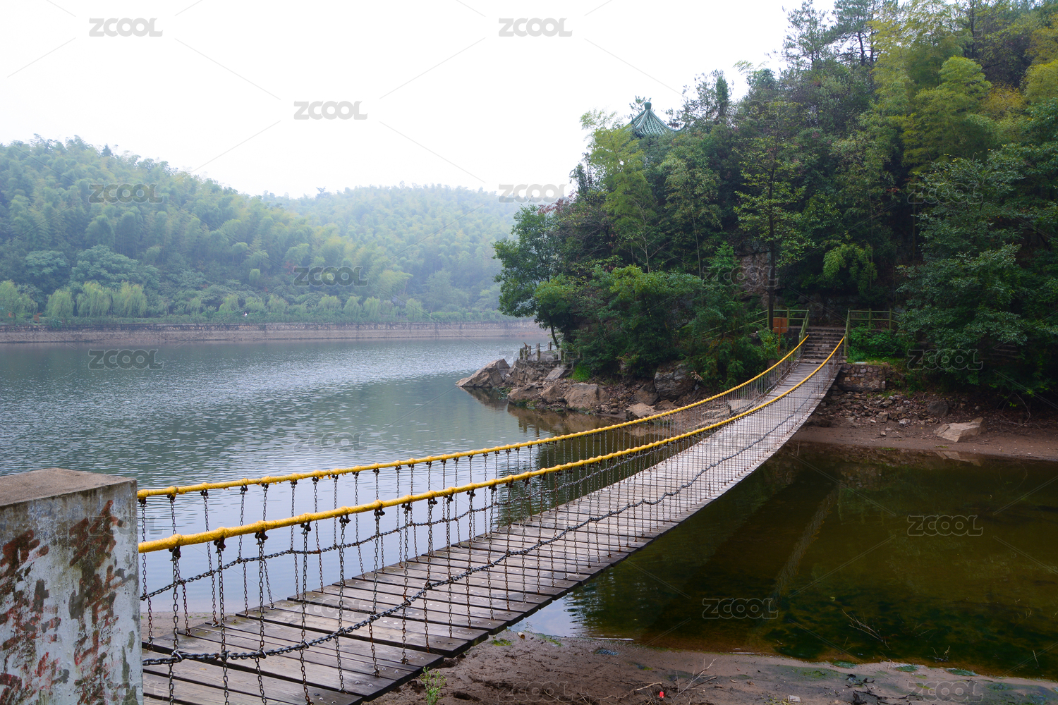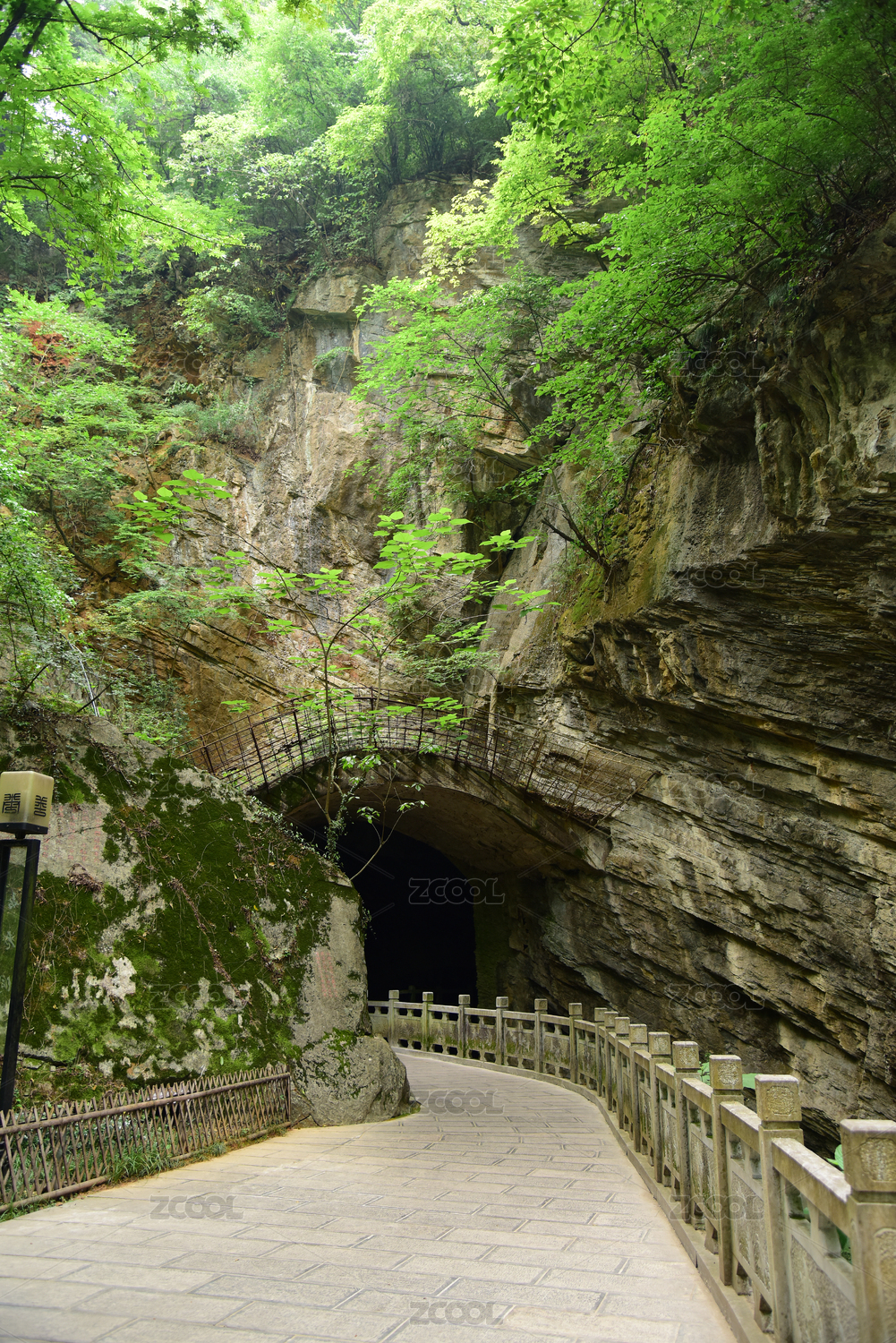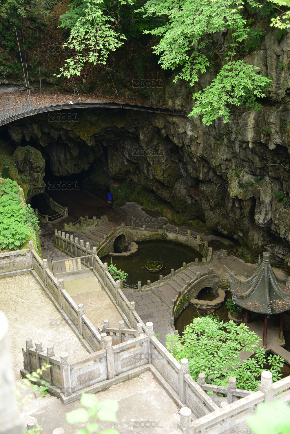 中國(guó)江蘇省無錫市宜興市善卷洞風(fēng)景區(qū)山洞口的小橋涼亭