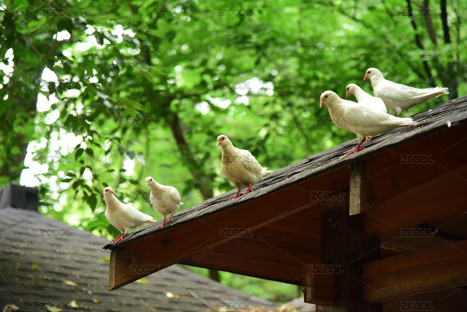 中國(guó)江蘇省無錫市宜興市善卷洞風(fēng)景區(qū)屋檐上的一群鴿子