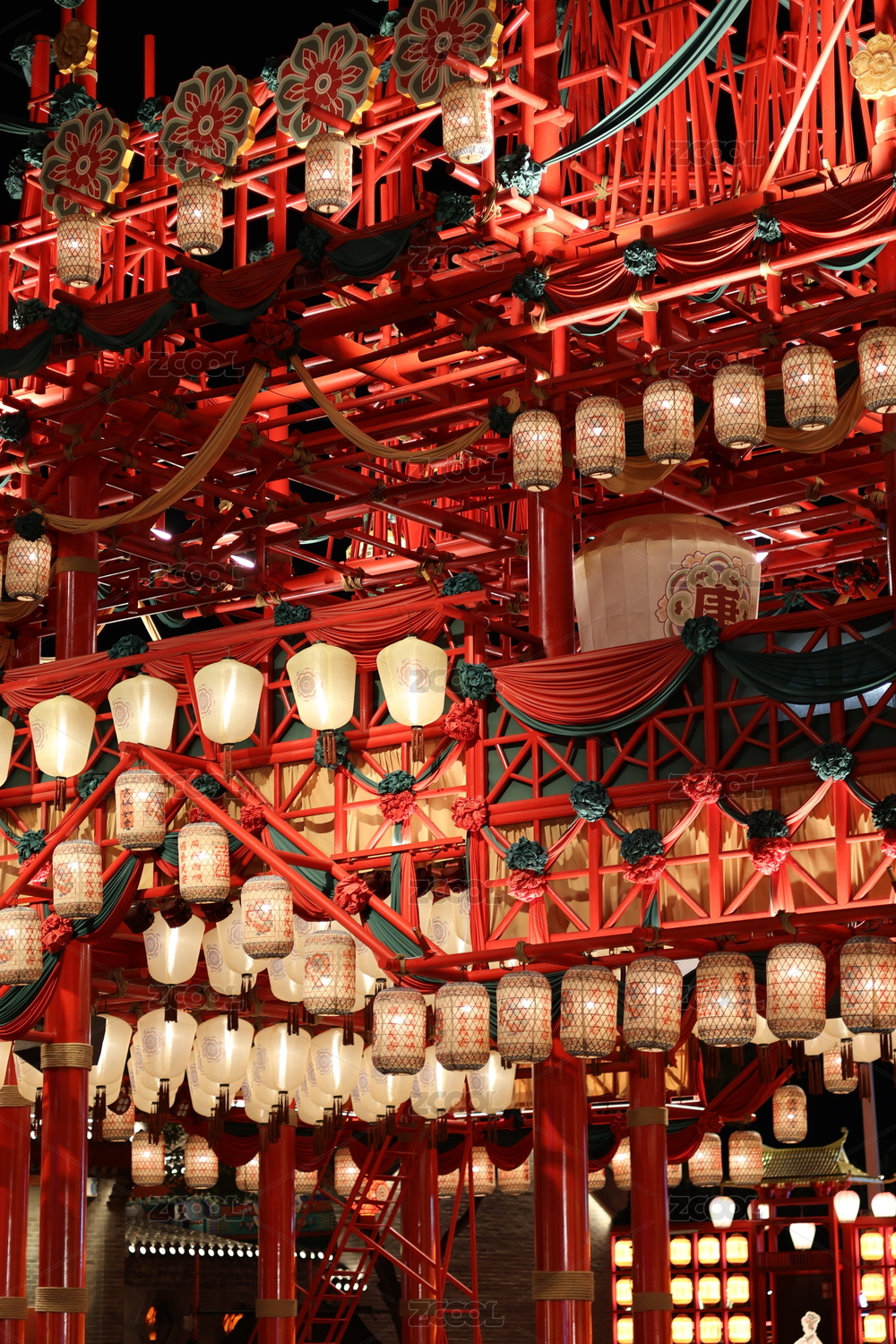 夜晚中式紅色框架結(jié)構(gòu)上的燈籠裝飾