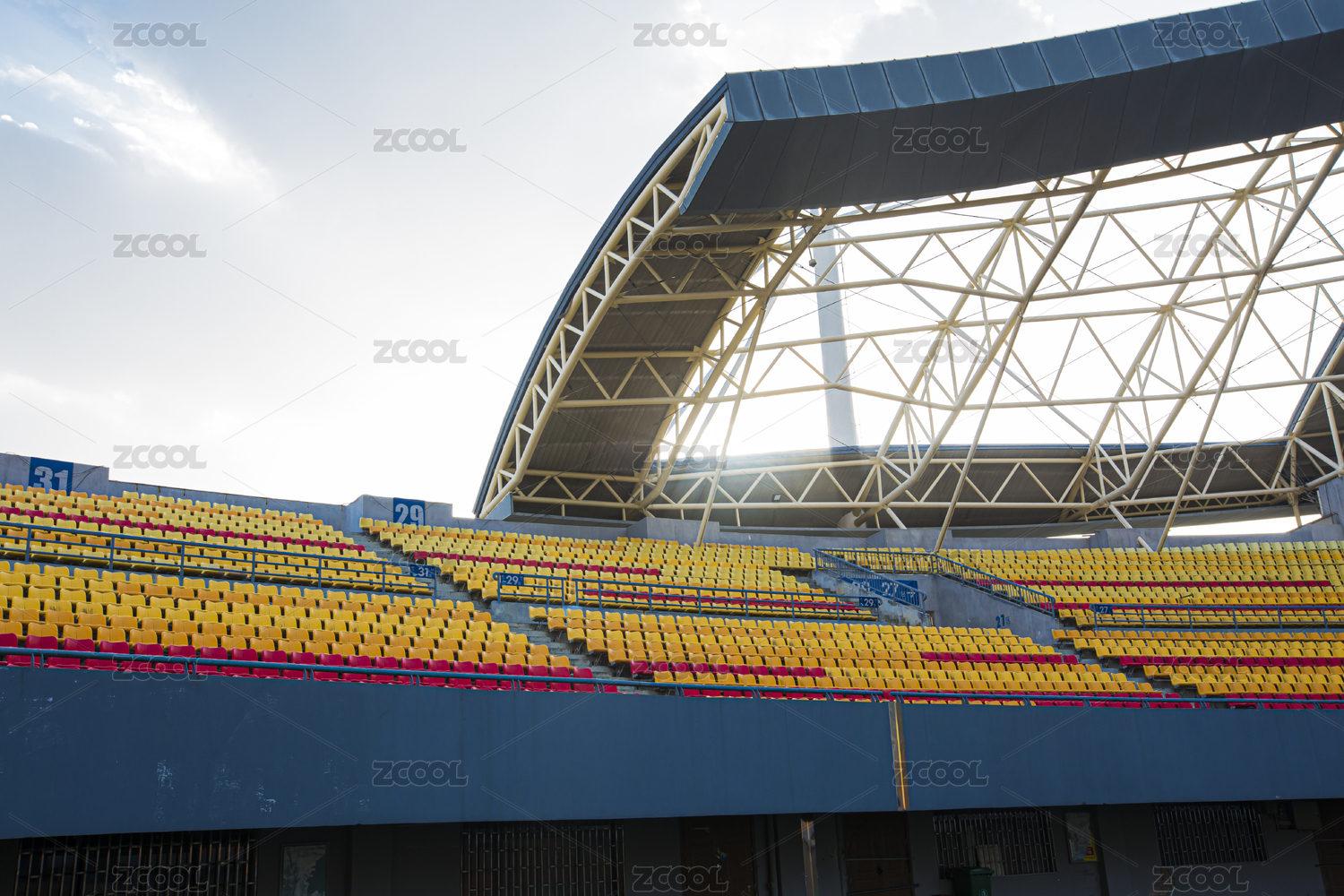 藍(lán)天白云下足球場(chǎng)的屋頂框架結(jié)構(gòu)