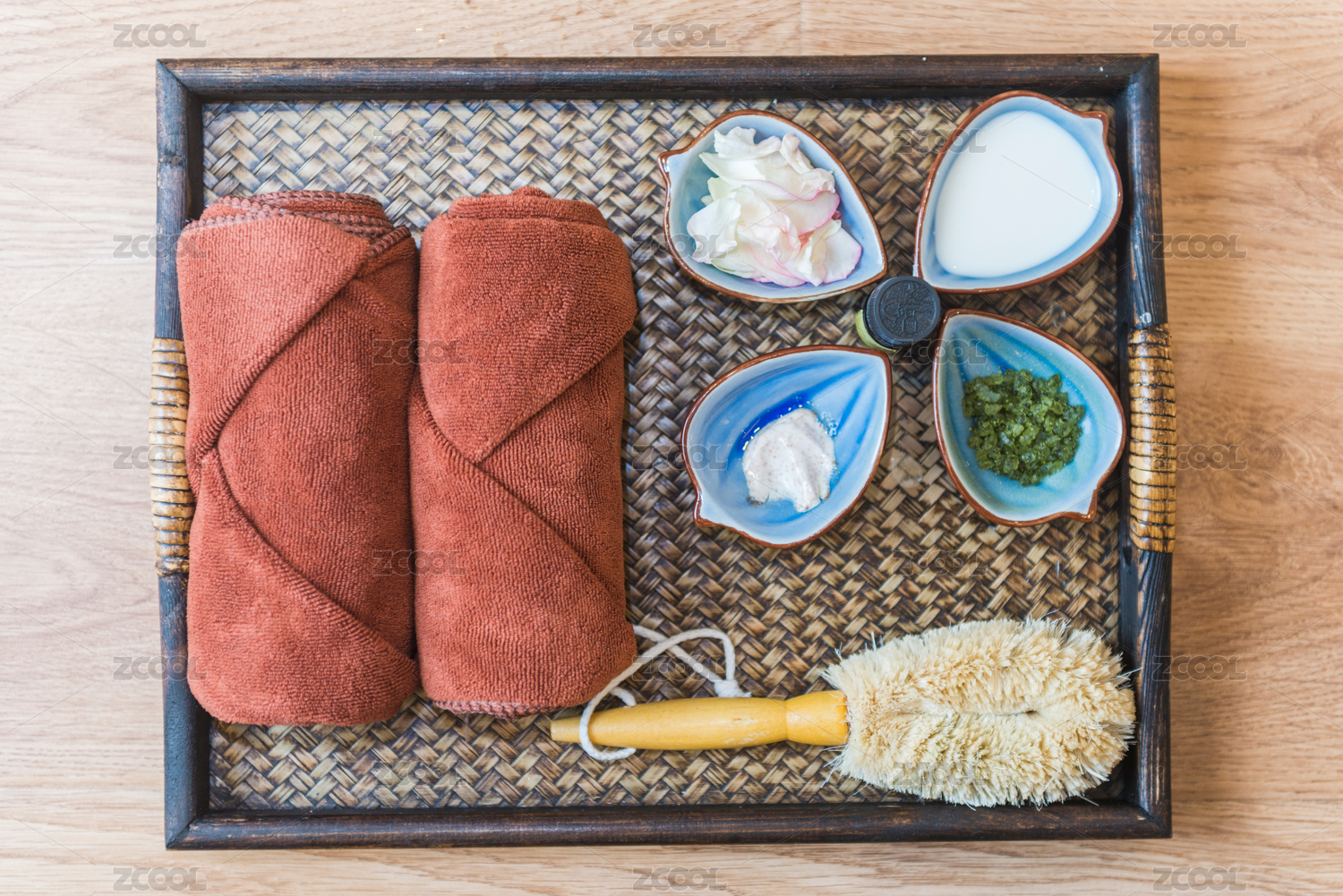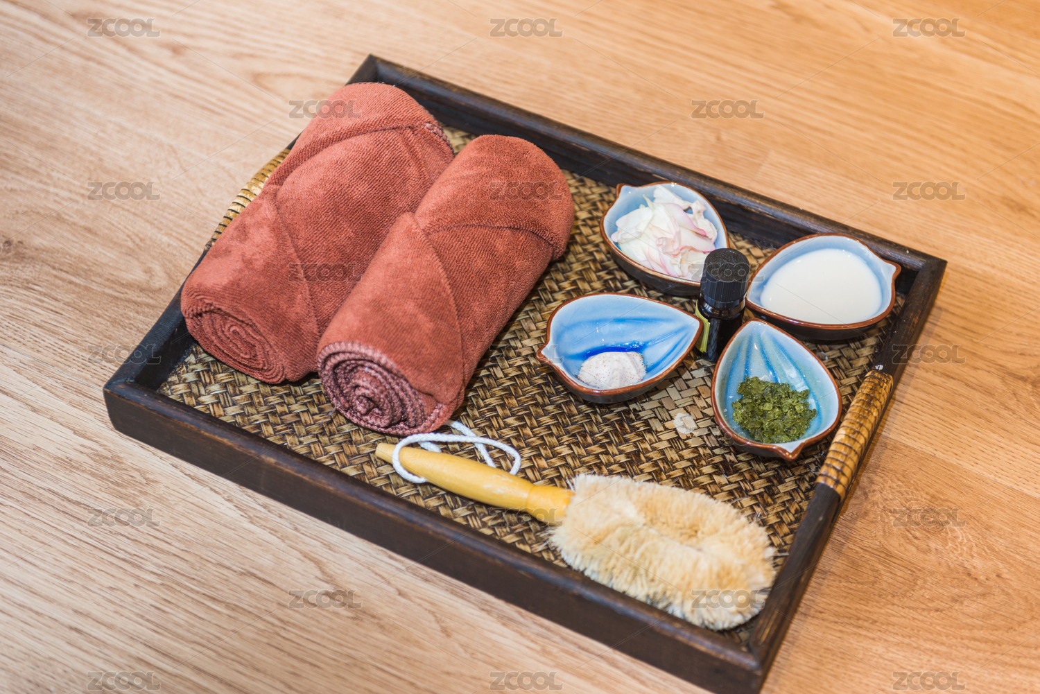 托盤(pán)內(nèi)包含海鹽牛奶鮮花和精油的健康足療用品