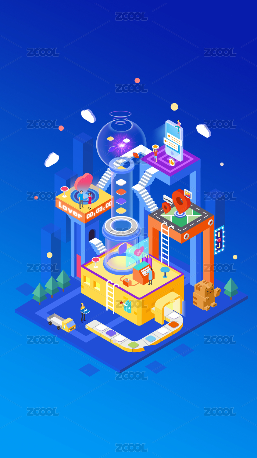 2.5D等距立體社區(qū)興趣交友插畫(huà)