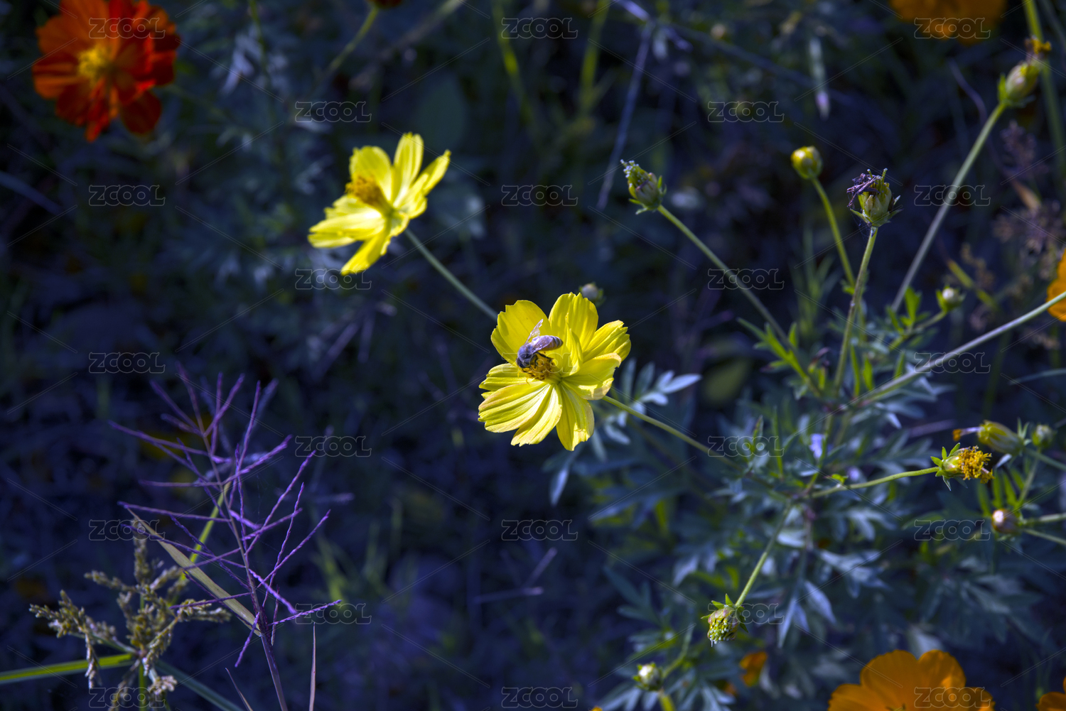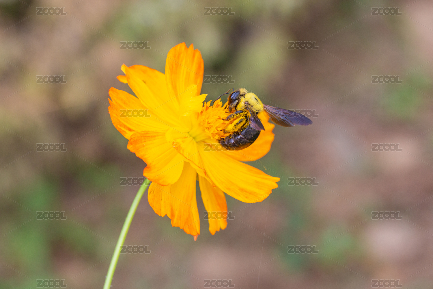 戶外春天盛開的黃色橙色黃秋英的花朵和蜜蜂