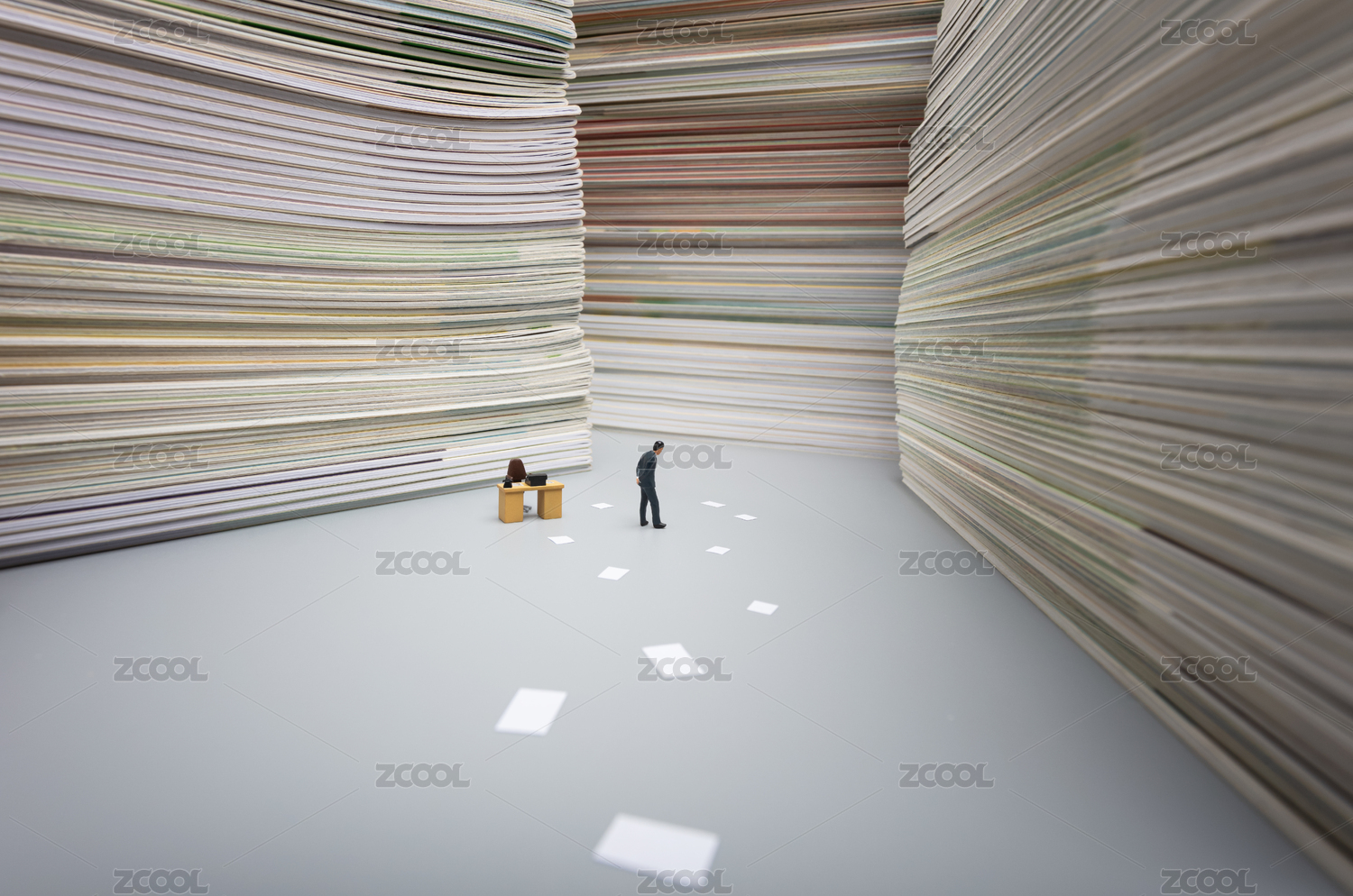 微縮創(chuàng)意堆積的文件辦公室里焦慮的中年男性