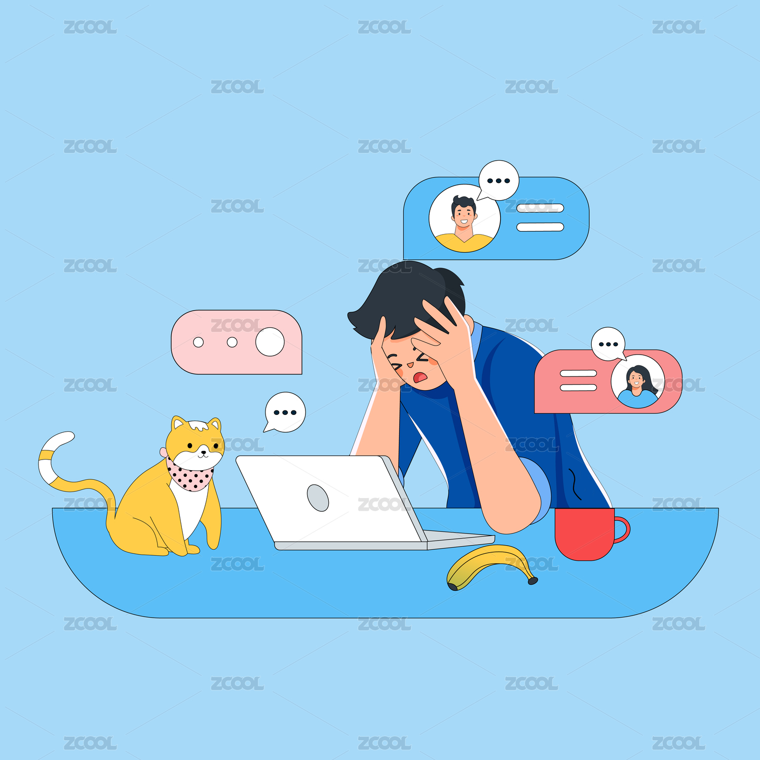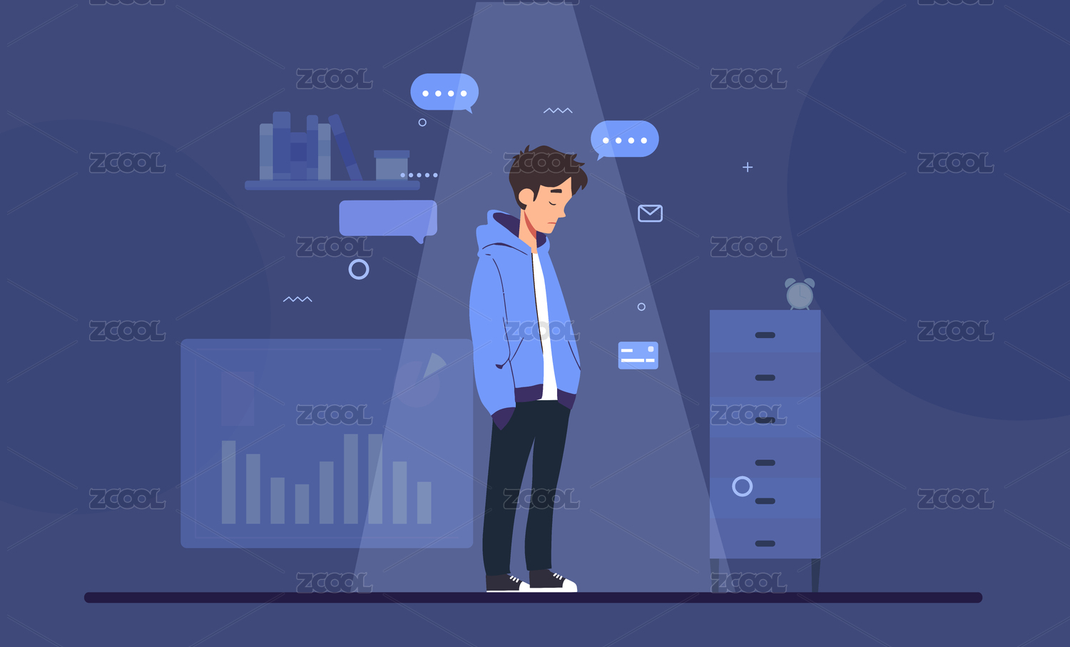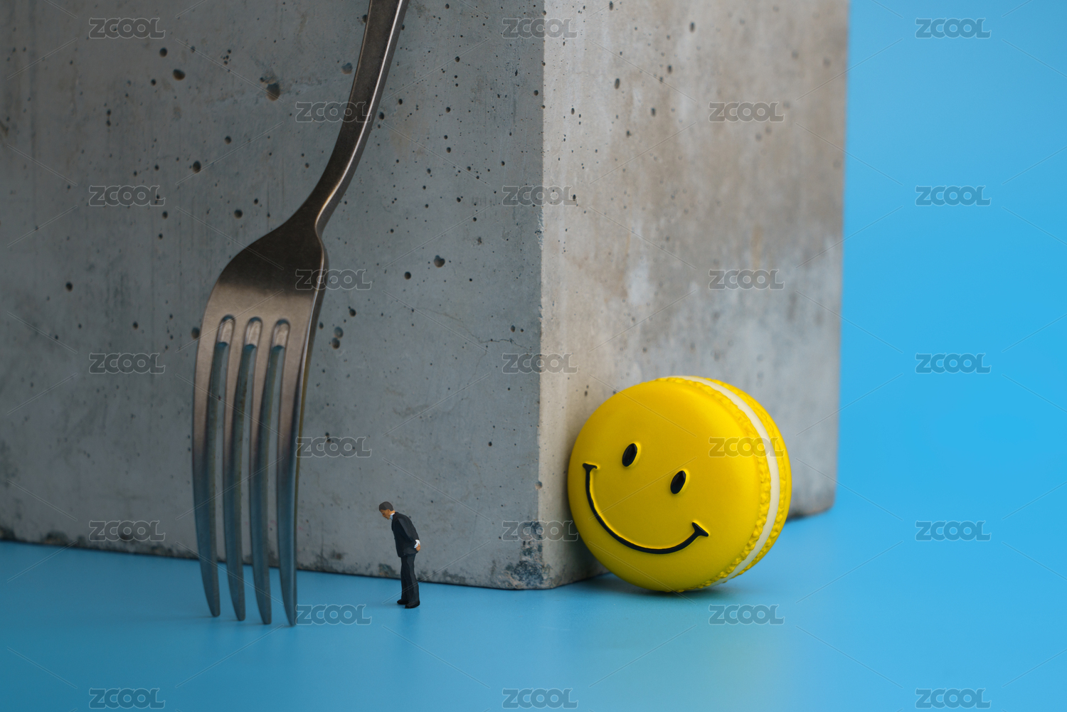 藍(lán)色背景中焦慮男士身后的黃色笑臉微縮創(chuàng)意