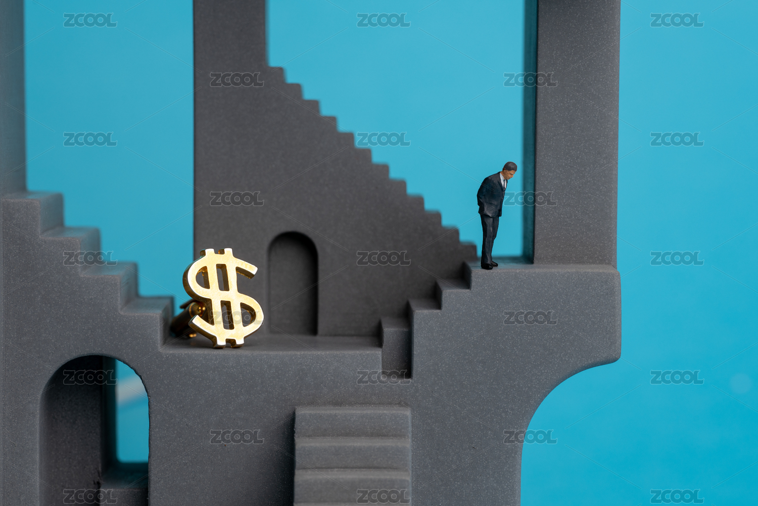 站在不同方向臺階上的焦慮男士和貨幣符號微