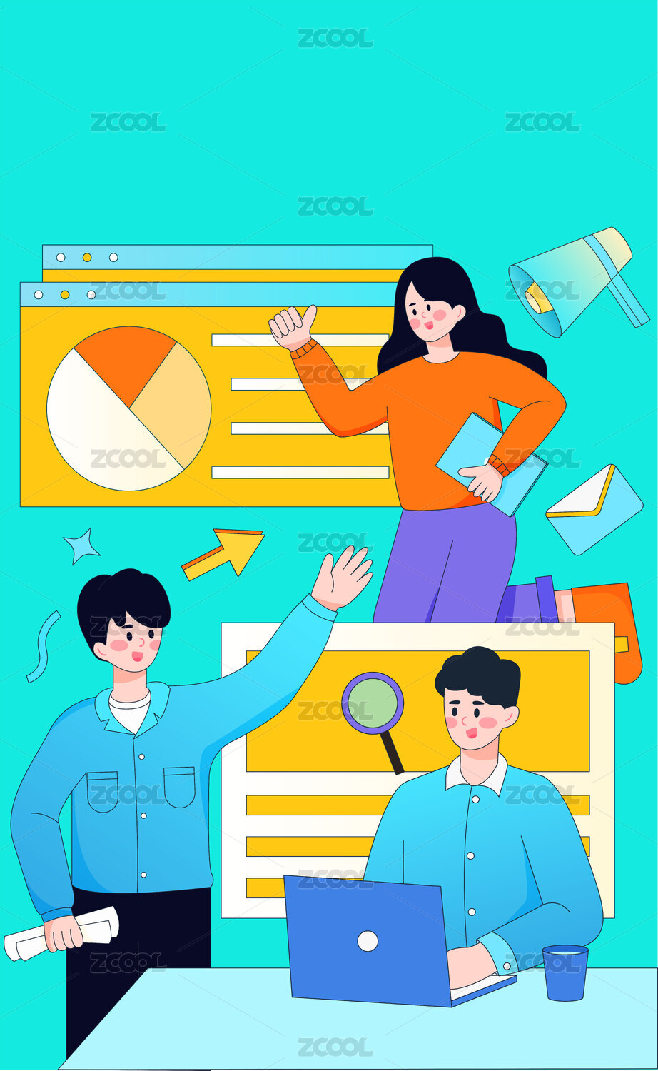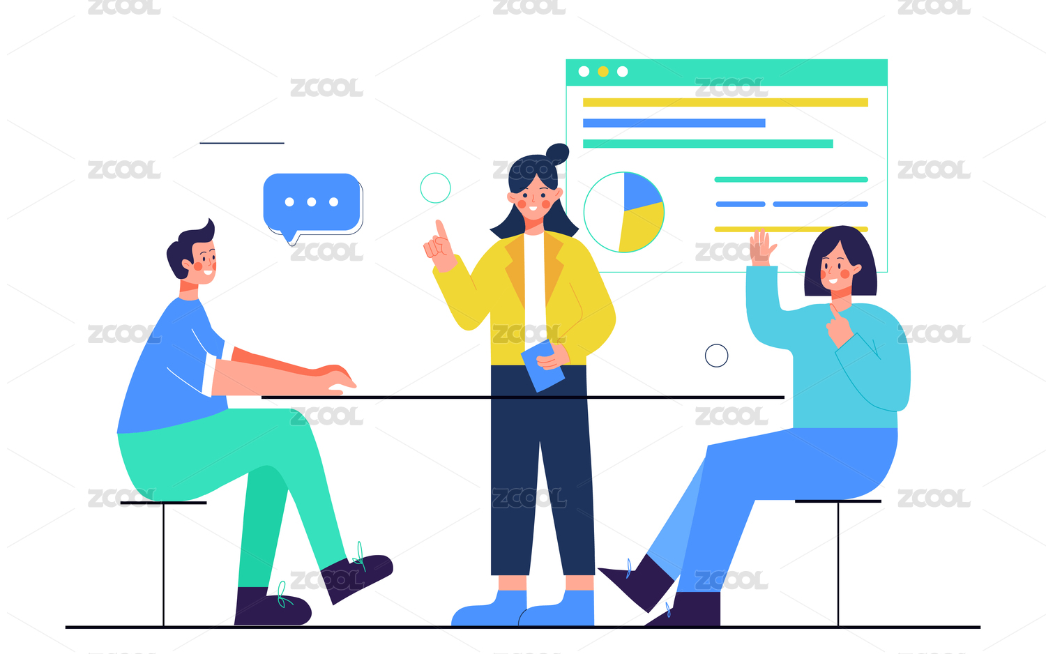 三個人在辦公室討論互聯(lián)網(wǎng)招聘扁平風格插圖