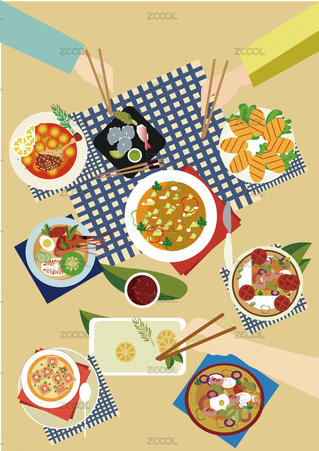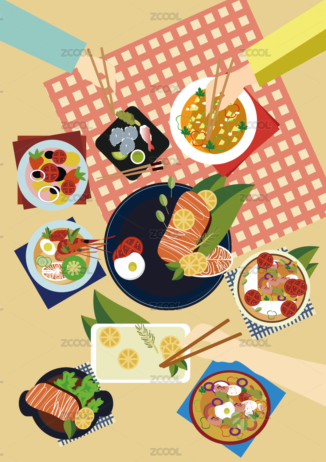三個人野炊郊游吃一桌美食矢量插畫