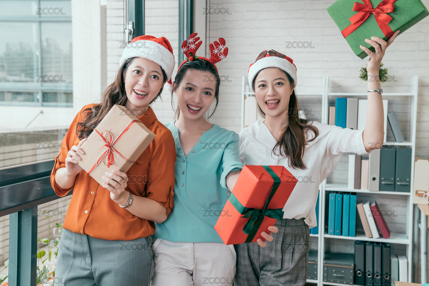 組三個人穿紅色圣誕帽,手持禮盒在辦公室里。