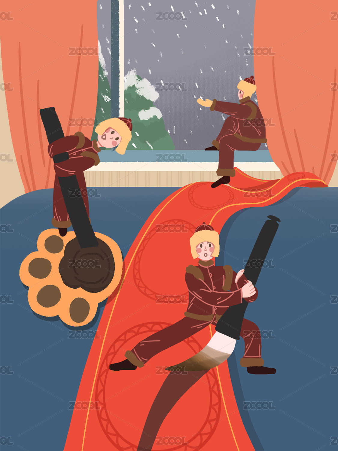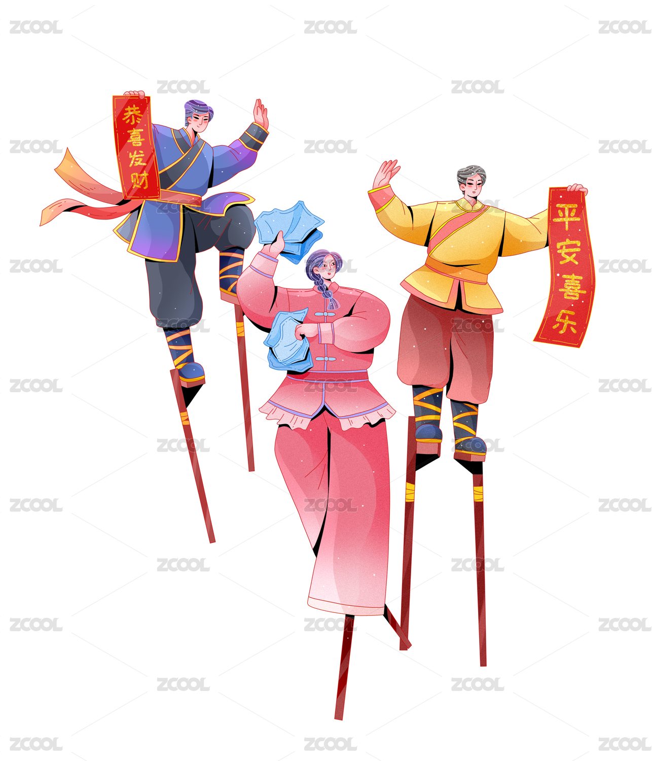 國潮風三個人踩高蹺