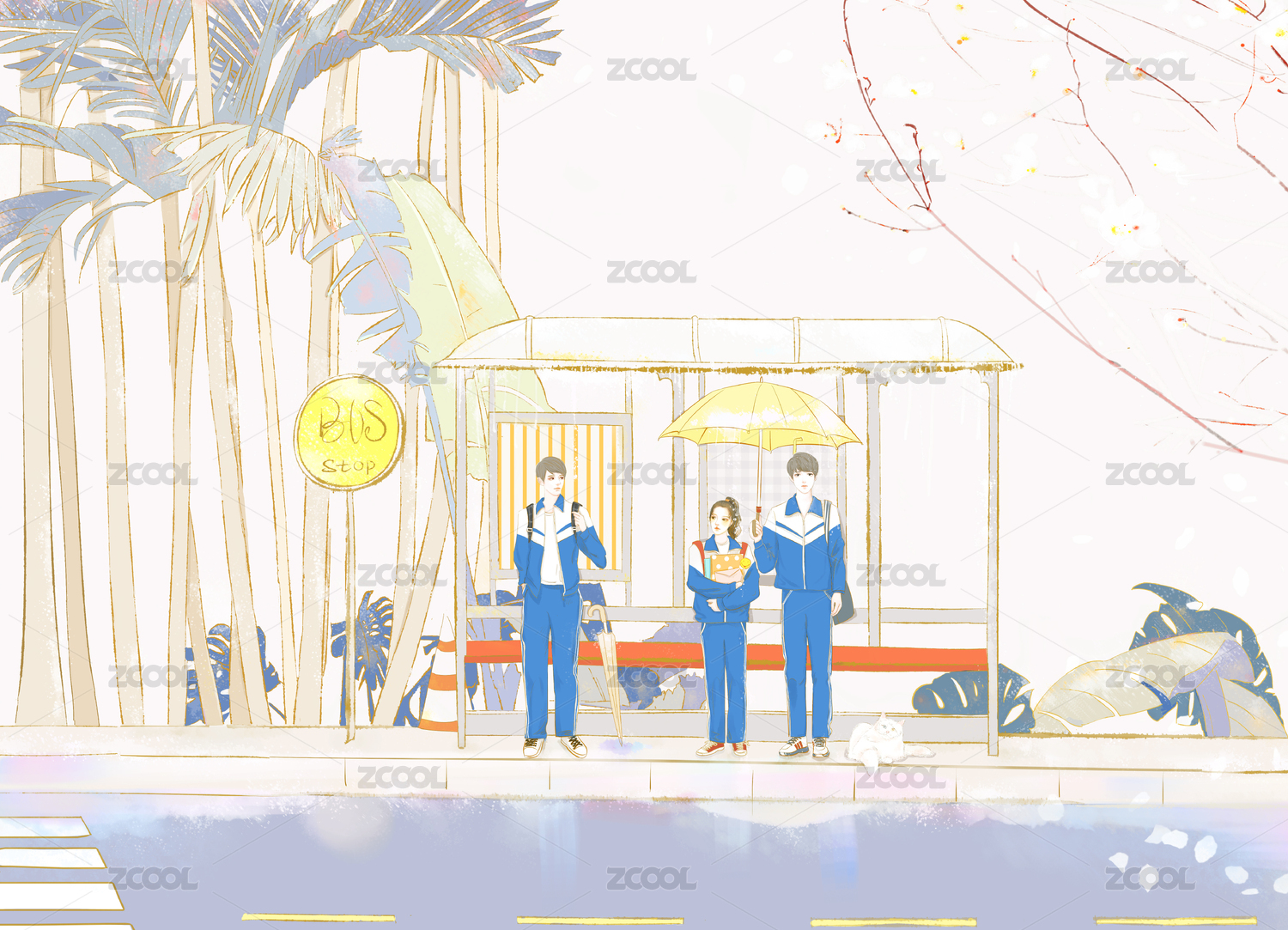 穿校服的三個人在公交車站