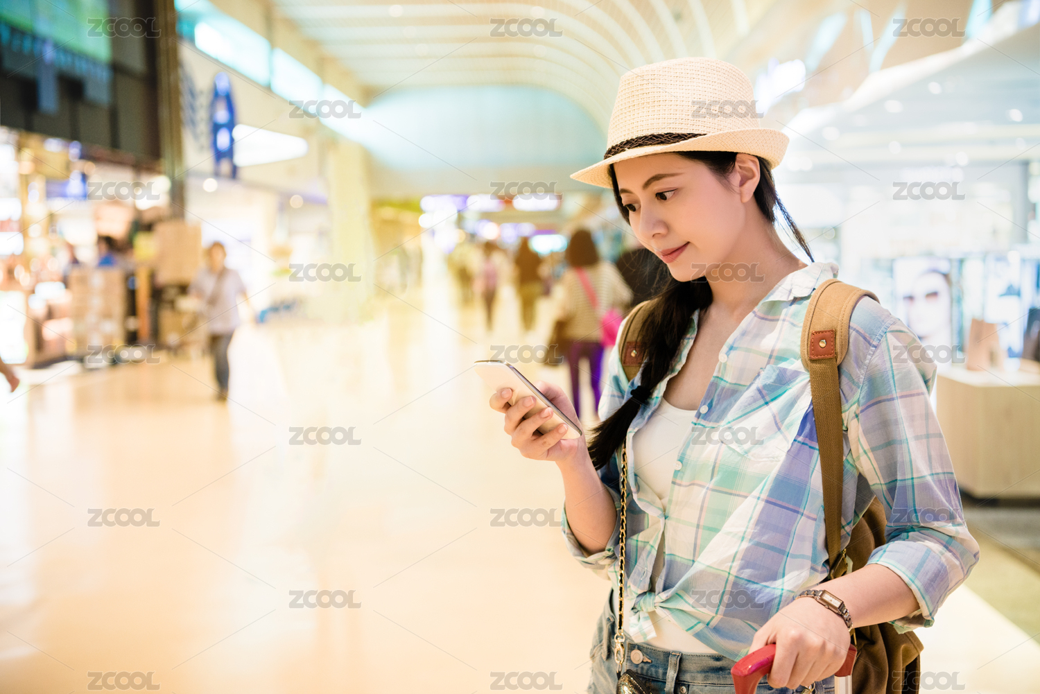 旅游女子在機(jī)場(chǎng)行李站著。利用周圍的免稅店她的智能手機(jī)發(fā)短信消息中的國(guó)際機(jī)場(chǎng)。